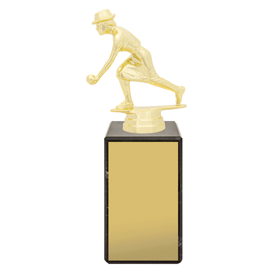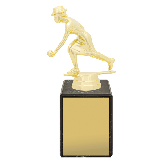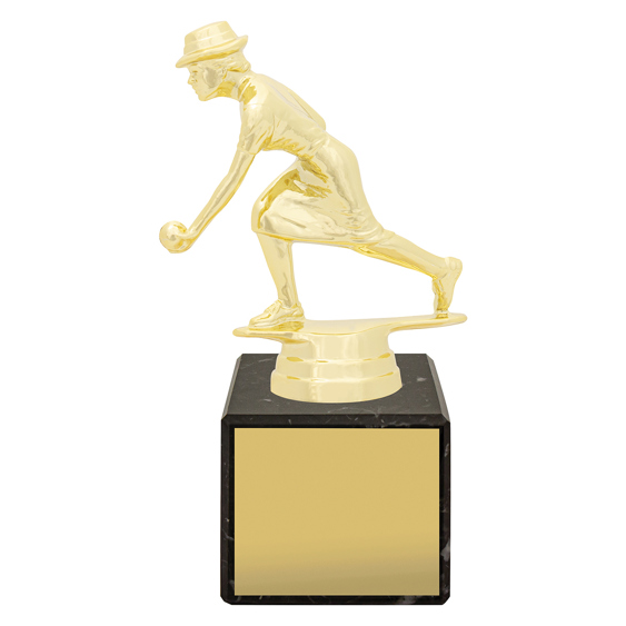 Gold plastic female lawn bowler trophy on a black marble base. A classic, affordable design suitable for all club levels, competition awards, and participation trophies.