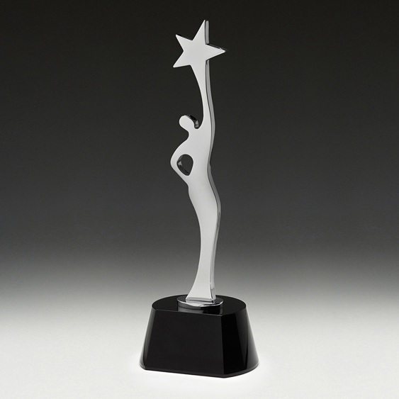 A modern silver metal trophy featuring a tall, elegant silhouette reaching upward to a star. Mounted on a polished black crystal base, it represents excellence, ambition, and aspiration.