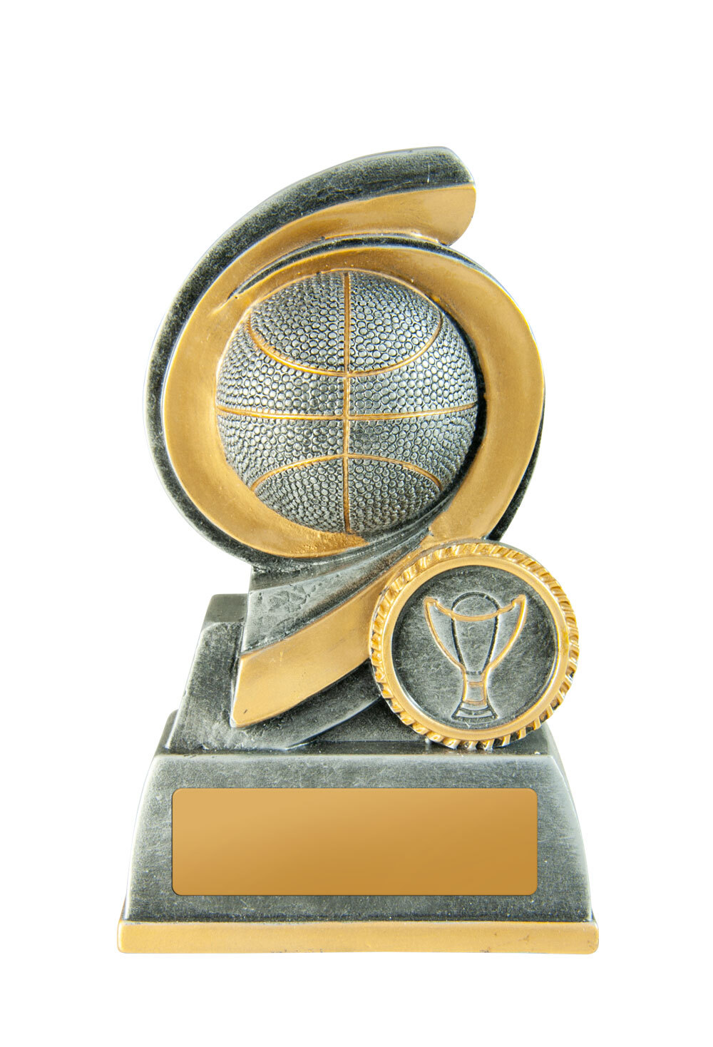 Resin basketball trophy with a 3D ball and hoop design. Finished in antique gold, this classic style includes a gold plate for engraving and is ideal for recognising performance and team spirit at any basketball event.