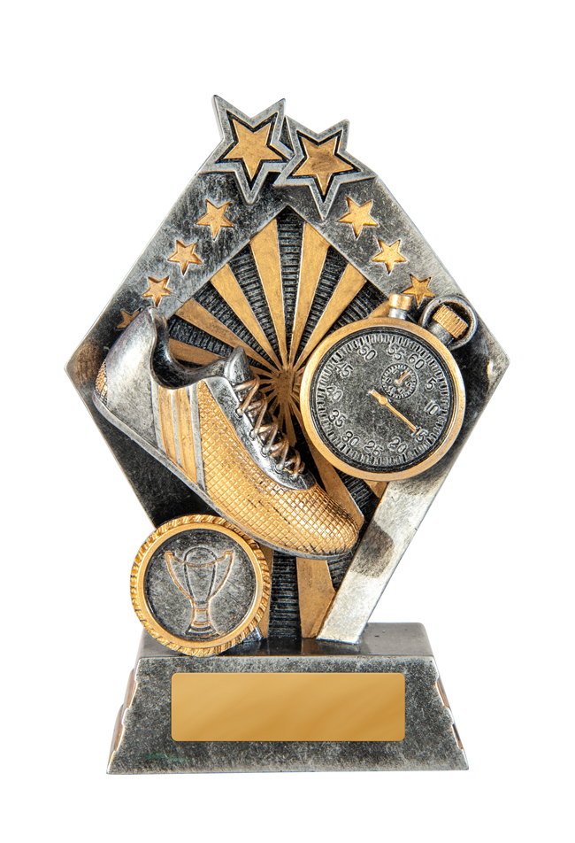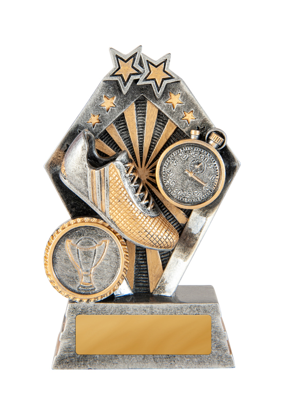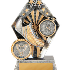 Celebrate achievement in athletics with this thoughtfully crafted trophy from the Sunrise Series. Showcasing a running shoe, stopwatch, and trophy emblem, its design symbolises sporting excellence. Available in a gold and silver finish and crafted from durable resin, this award comes in three sizes and is a trusted choice for athletics medal presentations.