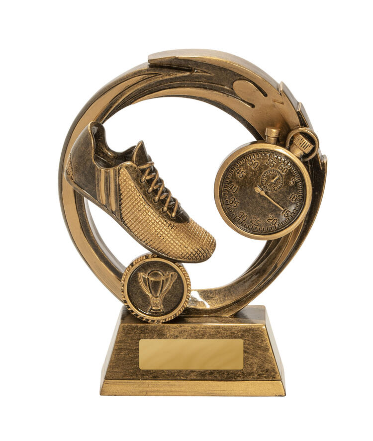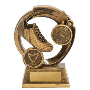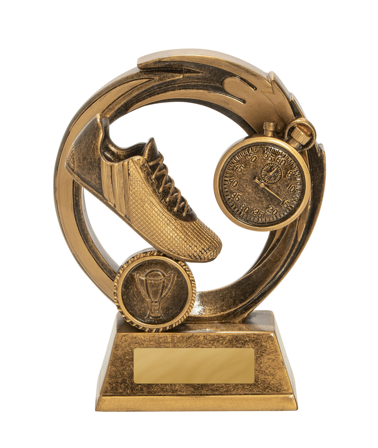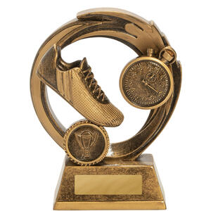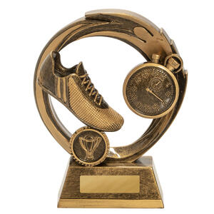 Crafted with a gold metallic finish, this athletics trophy offers a distinguished way to celebrate sporting achievement. Its circular form is anchored by a solid rectangular base, while detailed representations of a shoe, stopwatch, and trophy capture the spirit of competition. The 25mm centre provides an ideal focal point for custom recognition in athletics events.