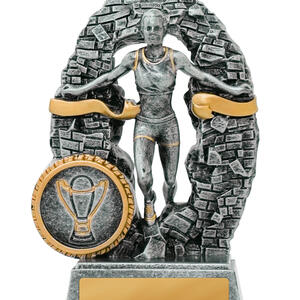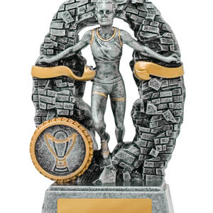 This female athletics trophy captures a moment of triumph, featuring a runner breaking through the finish ribbon against a striking brick wall backdrop. Crafted in durable resin with refined silver and gold tones, it conveys both strength and achievement. A round centre at the base provides space for a custom emblem, making this award a memorable choice for recognising outstanding athletes in running events.