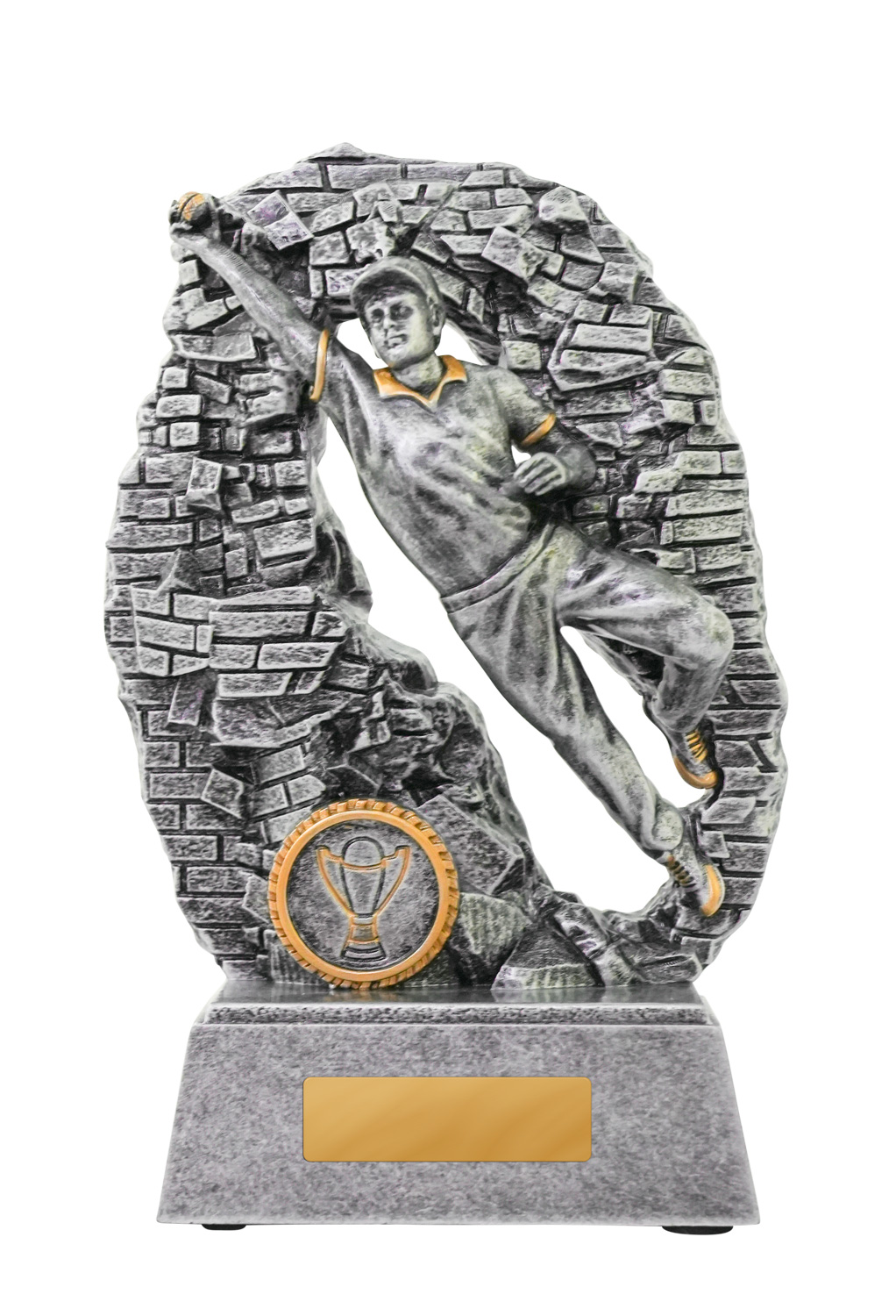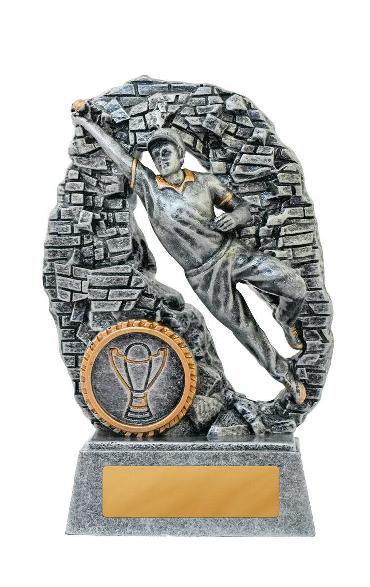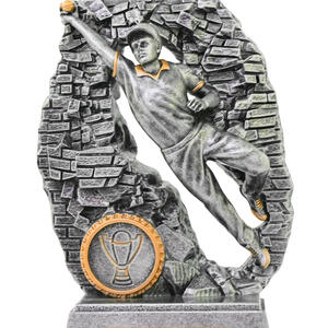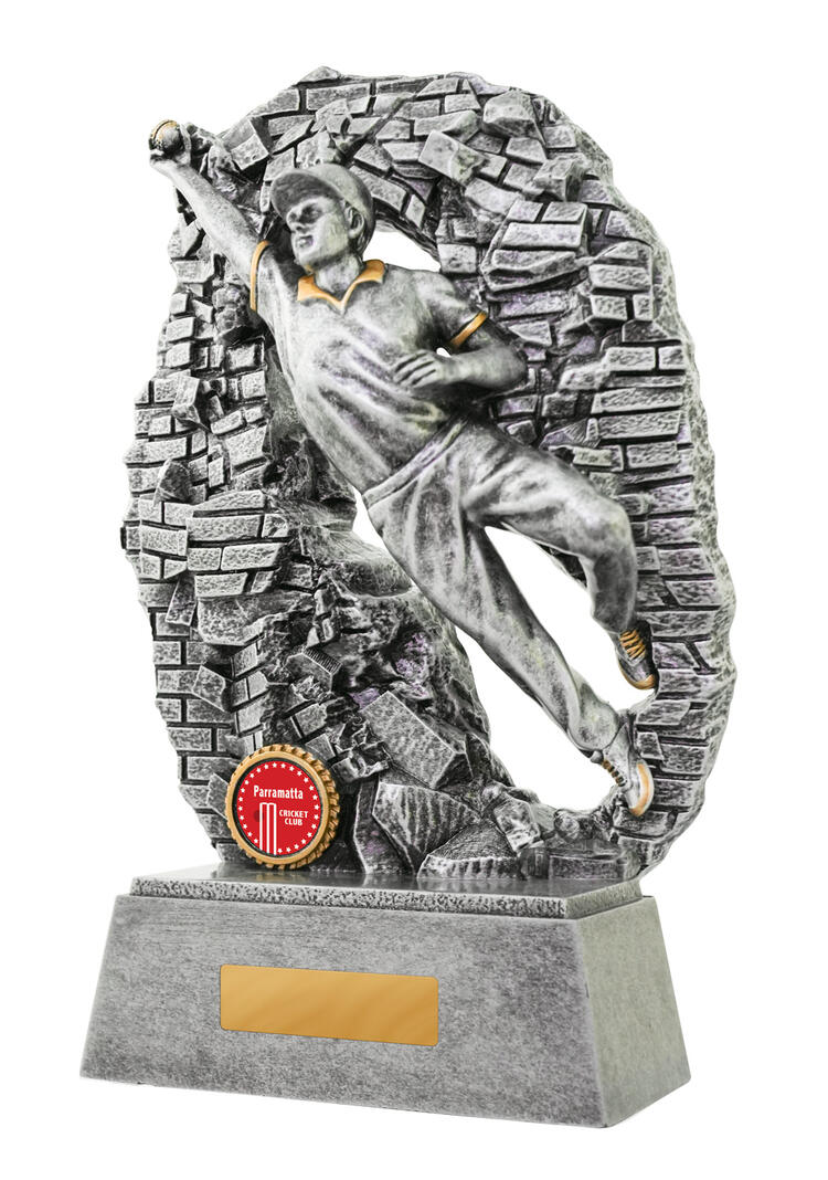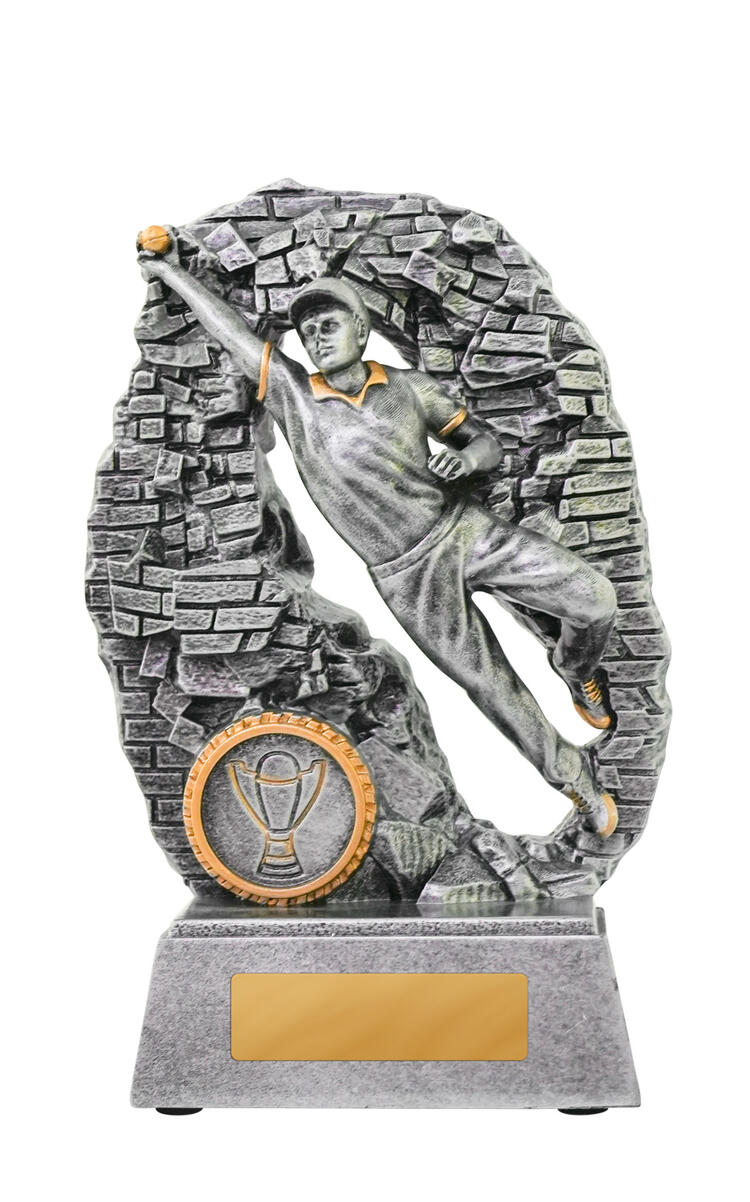 This cricket trophy captures the intensity of fielding excellence with a silver figure breaking through a wall to make a decisive catch. Gold accents highlight the dynamic pose, while the durable resin construction ensures lasting quality. Mounted on a rectangular base, it offers a trusted option for recognising sporting achievement in cricket.