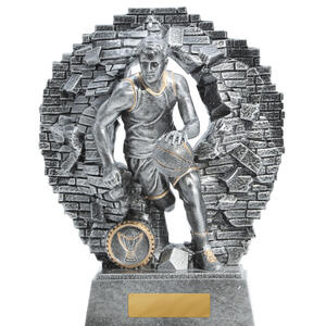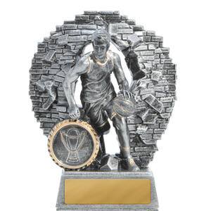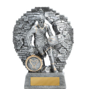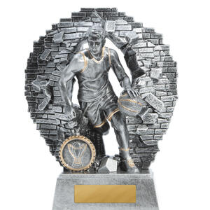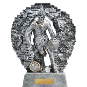 Celebrate sporting achievement with this basketball award, crafted to recognise determination and skill on the court. Featuring a male player in motion against a circular brick wall design, this trophy artfully symbolises breaking down barriers. It combines a strong, durable resin build with basketball and trophy emblem details for a memorable presentation.