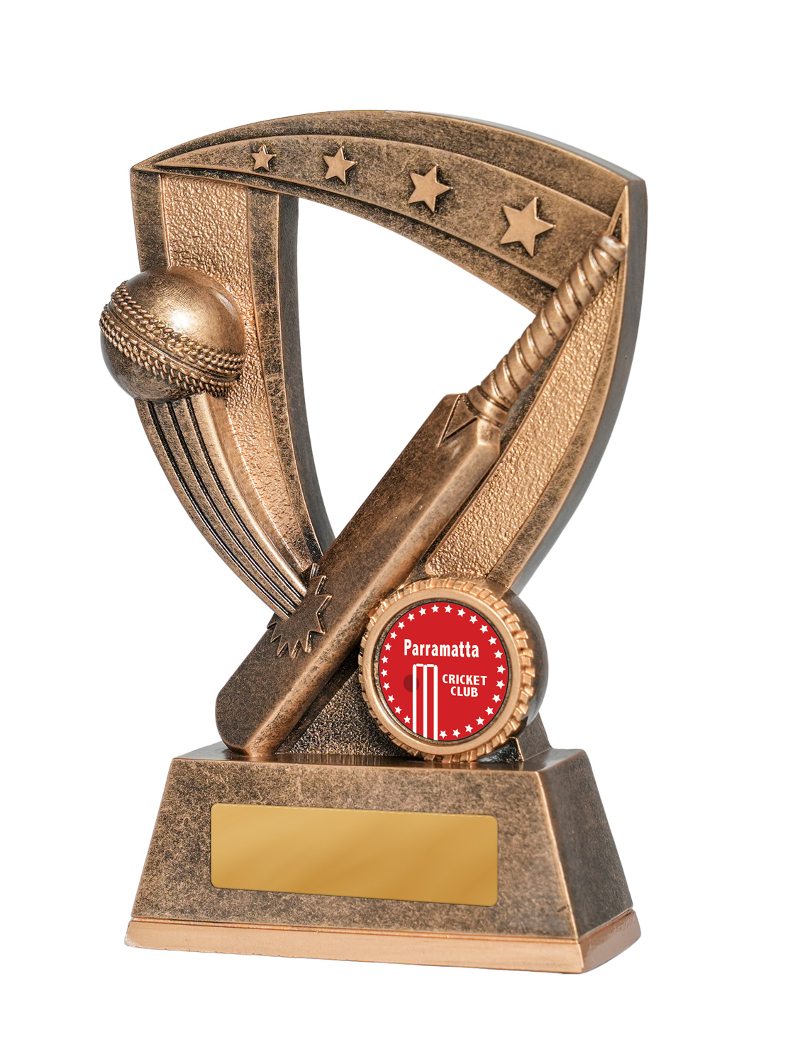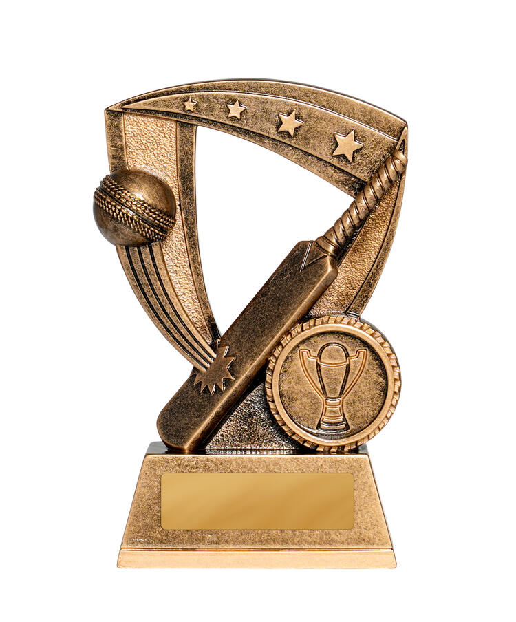 This cricket trophy features a bold cricket bat and ball design accented by a dynamic star motif, all set in a refined gold metallic finish. The sturdy construction offers durability while the vibrant 25mm centre provides space for personalisation, making it ideal for recognising individual or team achievement. An excellent choice for club, school, or community cricket events.