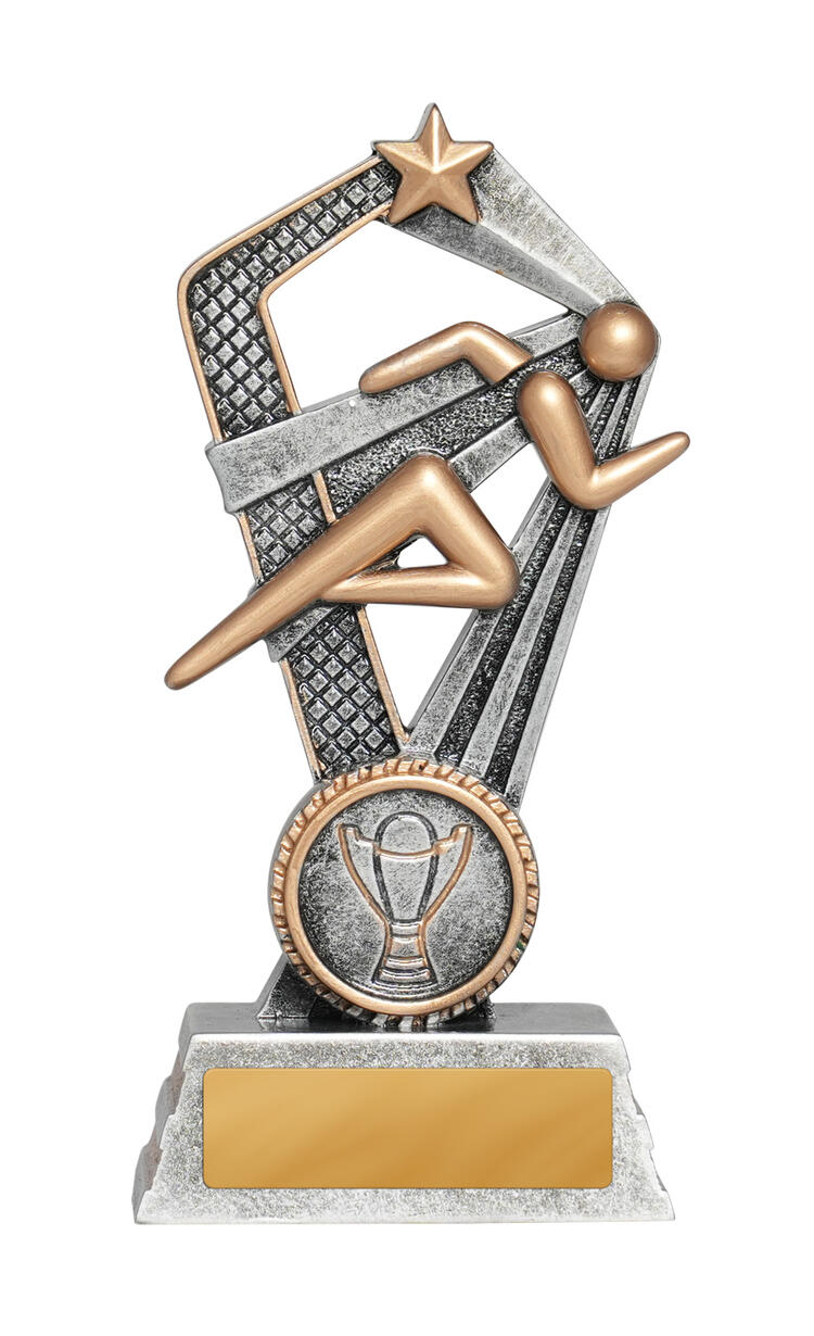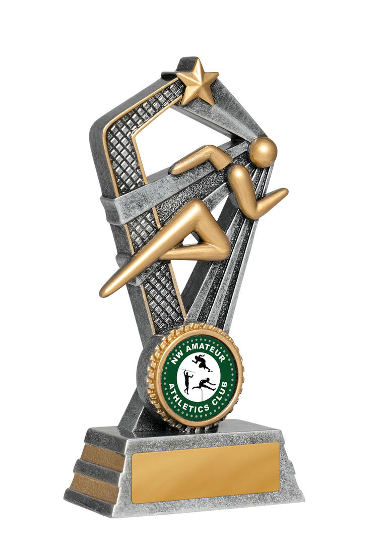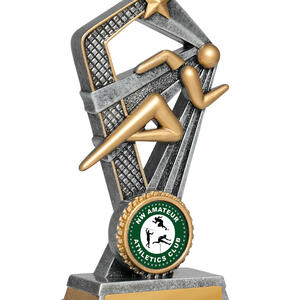 Celebrate athletic excellence with this Santorini Series athletics trophy, featuring a sleek running figure set alongside a bold star. Its striking cut out design and gold with silver finish make it a memorable piece for podium moments. Crafted from resin for durability, it includes a 25mm circular emblem area for personalised recognition at any athletics event.
