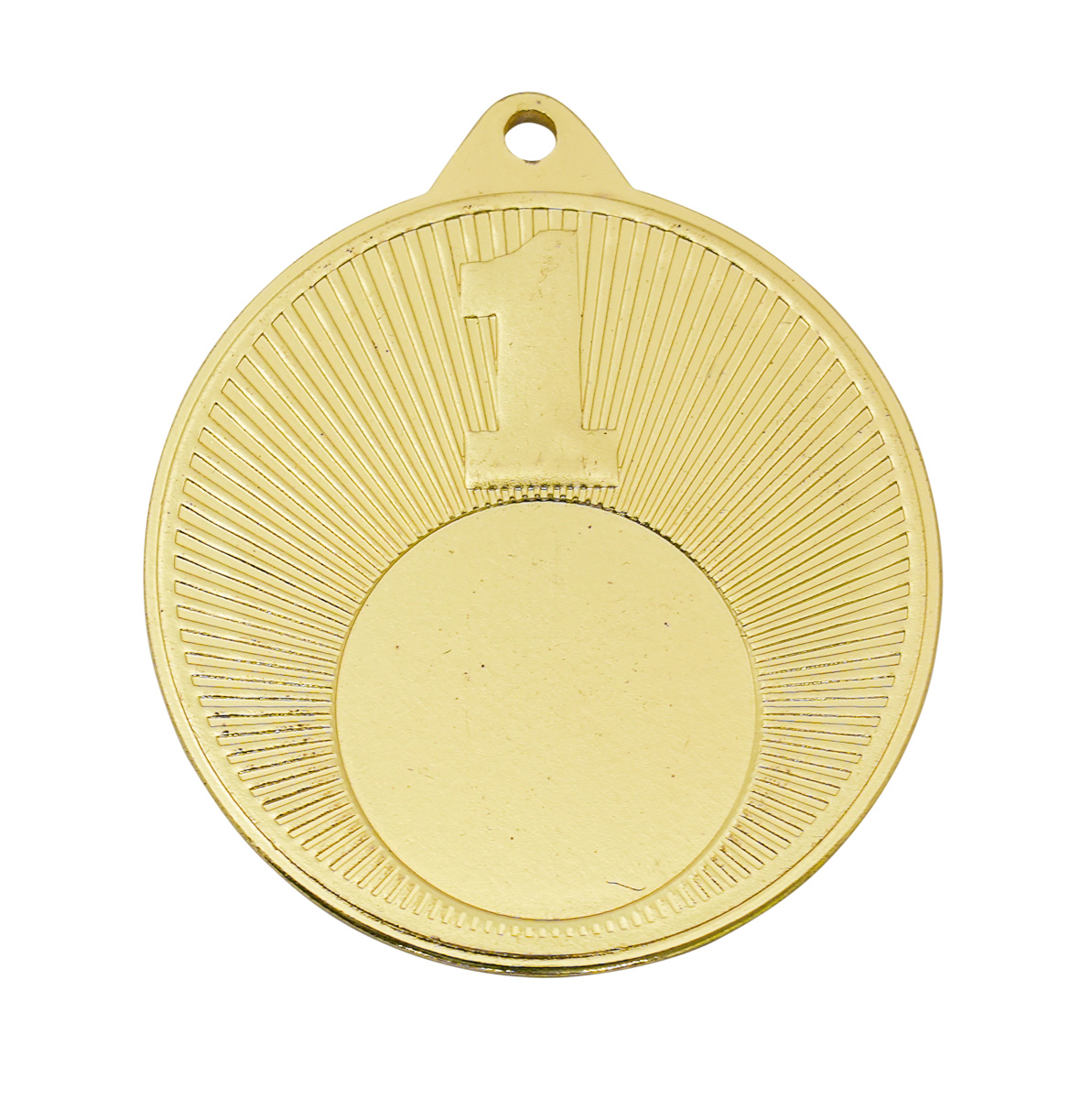 This gold first place medal is crafted from durable metal, featuring a striking embossed number '1' at its centre. The circular design is enhanced by a textured radial pattern that adds a refined touch, while a loop at the top allows for easy ribbon attachment. A professional choice for recognising outstanding achievement in any sporting event.