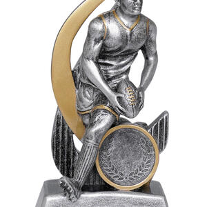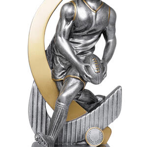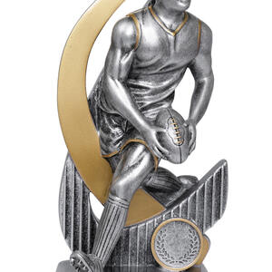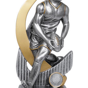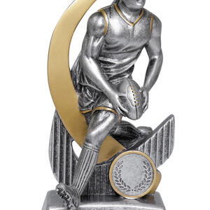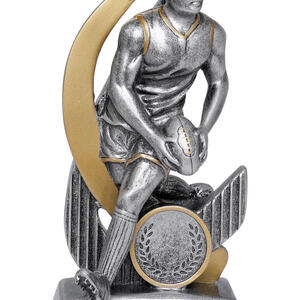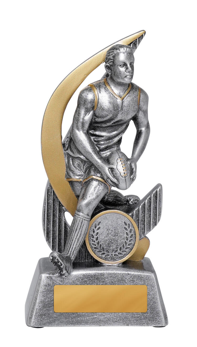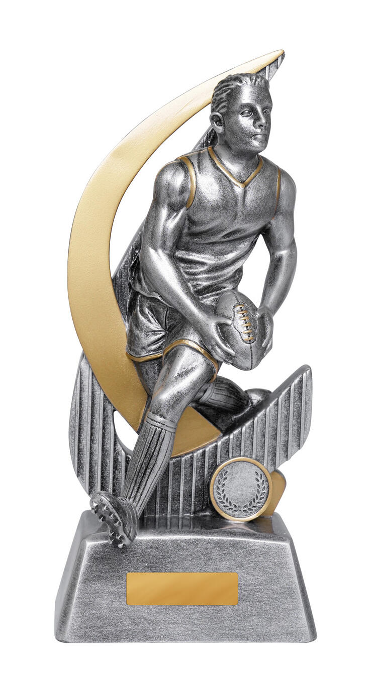 Crafted for distinction, this aussie rules footy trophy features a dynamic male figure poised with a football, set against a sleek curved design and sturdy circular base. Finished in metallic gold and silver tones, the trophy's elegant resin construction is complemented by a laurel wreath motif, marking achievement with enduring style.