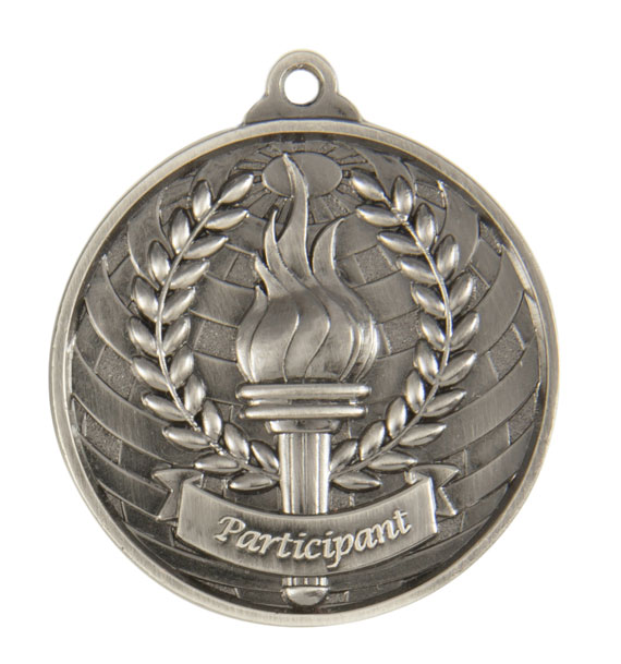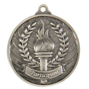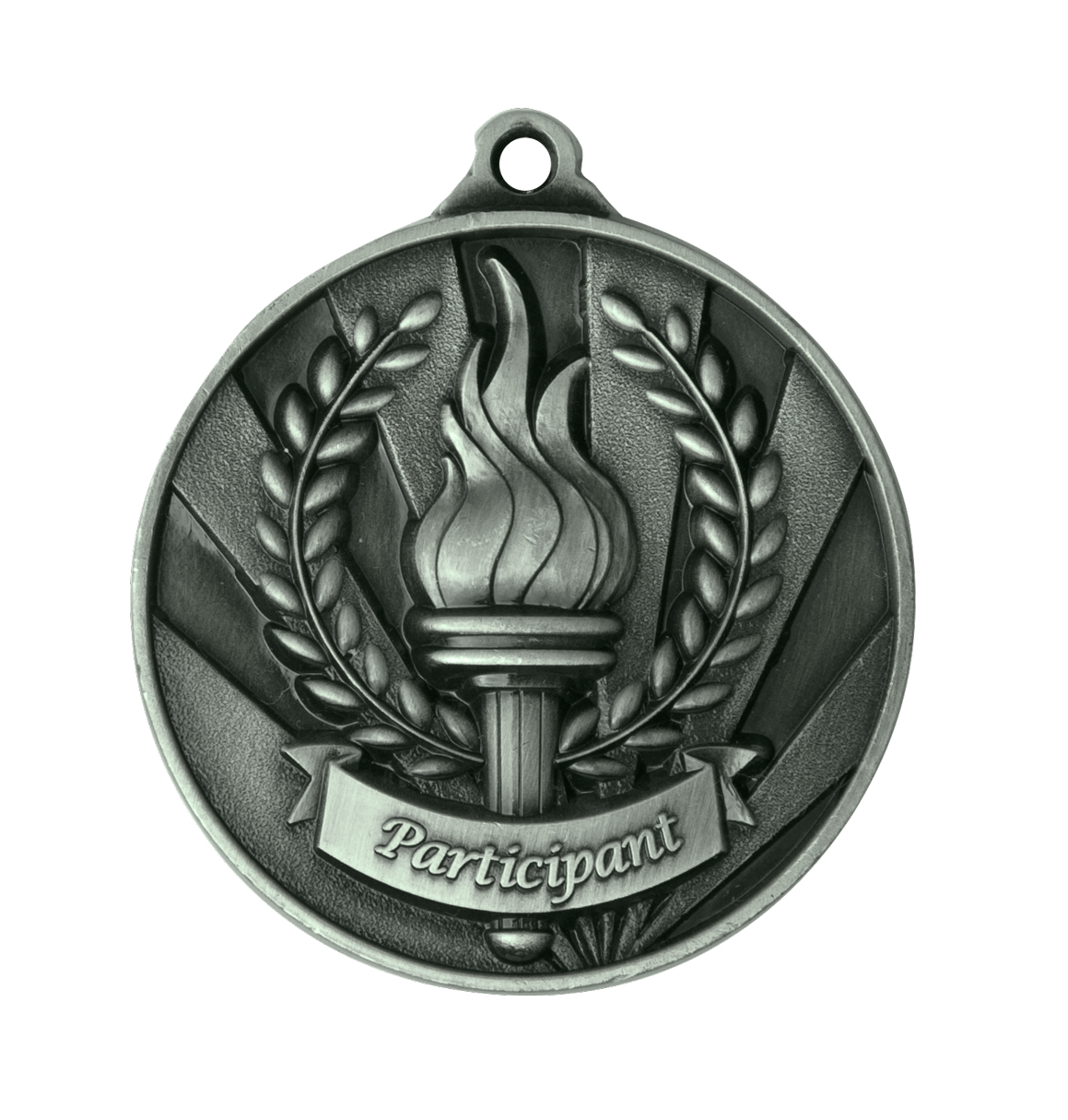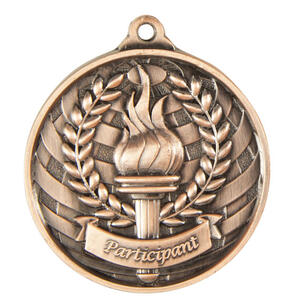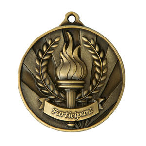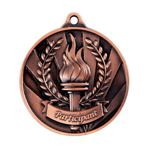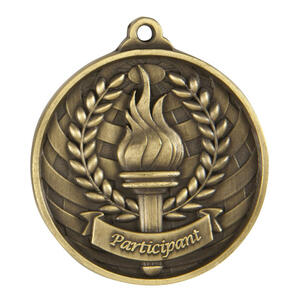 This durable victory medal features a classic circular design with a prominent loop for ribbon attachment. Finished in your choice of gold, silver, or bronze, it displays a detailed torch and laurel wreath motif with 'Participant' highlighted on a ribbon banner.