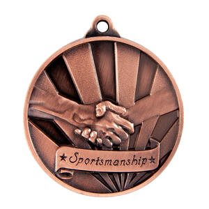 Celebrate the spirit of fair play with this 50mm Sunrise sports medal, crafted from metal in your choice of gold, silver, or bronze finish. Its circular design features a classic handshake motif and 'Sportsmanship' banner, making it an elegant choice for recognising teamwork and integrity across any sporting event.