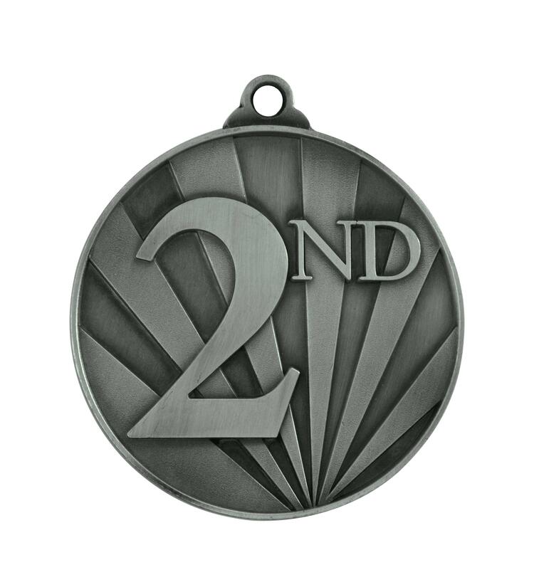 Celebrate achievement with this 2nd place medal, crafted from metal in a striking silver finish. Its circular design features a bold '2nd' emblem, set against a radiant sunburst pattern for a distinguished and memorable presentation. At 70mm, this professional award is ideal for recognising excellence across all general sports competitions.