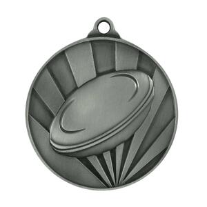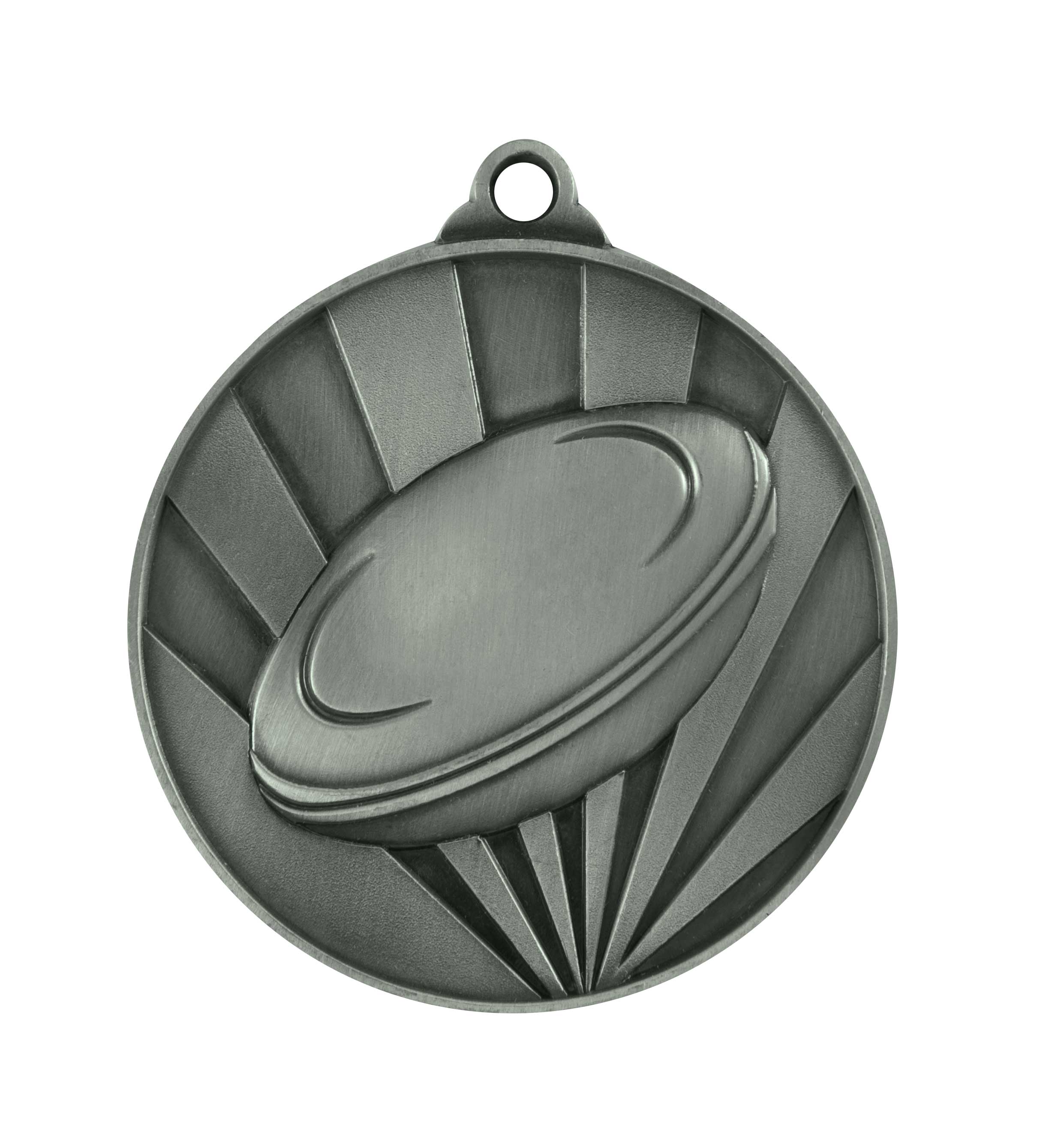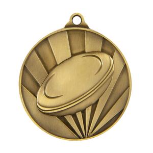This rugby medal combines a sleek circular profile with a refined disc motif, highlighted by radiating lines for a contemporary finish. Crafted from metal, it is available in gold, silver, and bronze tones, making it a versatile choice for achievement in sport. The integrated loop provides easy ribbon attachment for professional presentation.