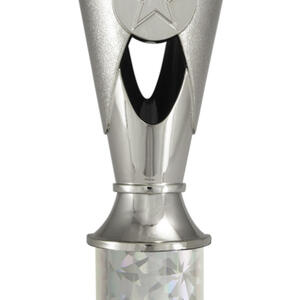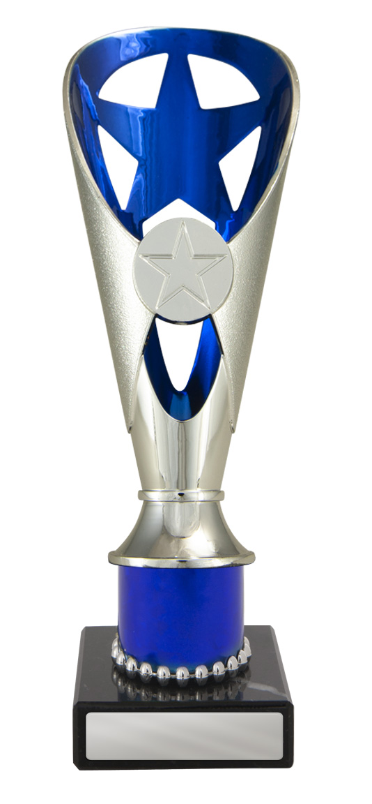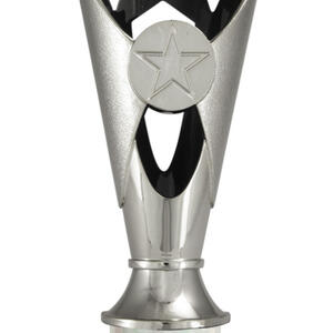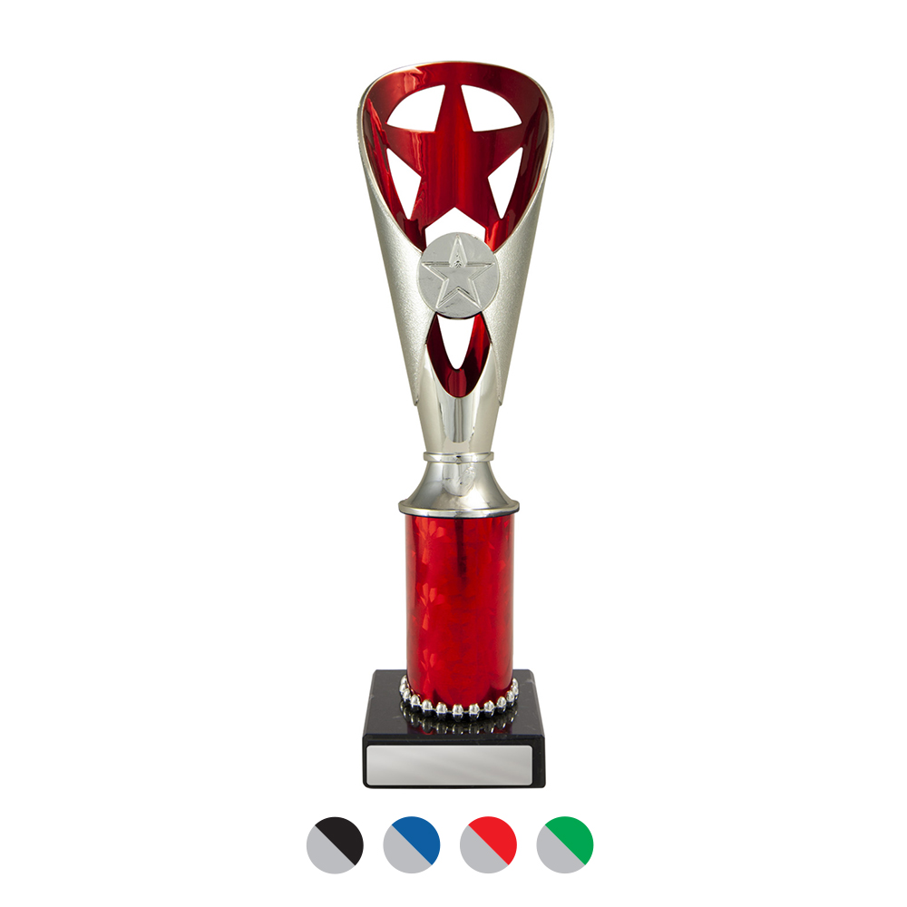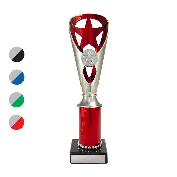 A versatile budget trophy cup for all sporting occasions, this design features a sleek base with a flared top and a distinctive star motif. The trophy is available in silver and black, red, green, or blue, with a base that adds a polished touch. Durable metal and plastic construction and five size options ensure a professional and reliable solution for recognising achievement in any setting.