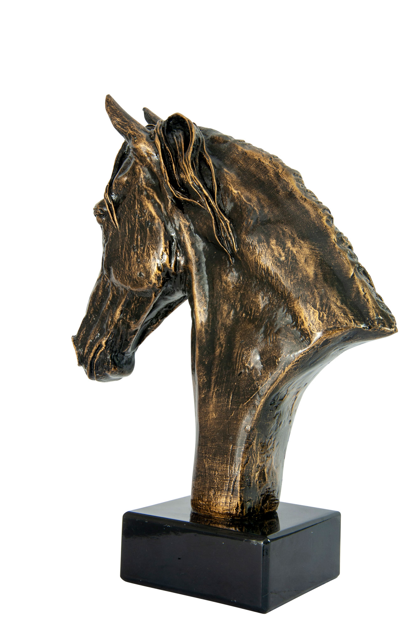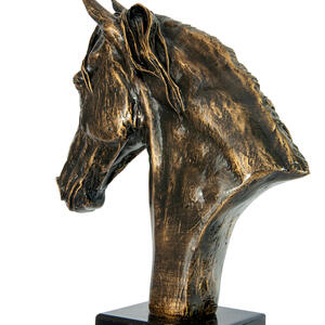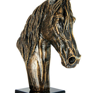 This horse trophy features an intricately detailed horse head bust, finished in rich bronze tones and set on a contrasting black base. Crafted with a metallic finish and mounted on a base, it presents a refined and durable option for recognising achievement in equestrian pursuits.