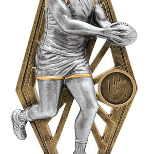 Celebrate achievement in Australian Rules Football with an afl trophy crafted for standout recognition. This award features a male athlete in motion, captured in a dynamic running pose with football in hand, set against a decorative background. The elegant design rests on a robust triangular marble base and includes space for personalisation.