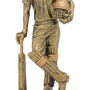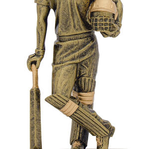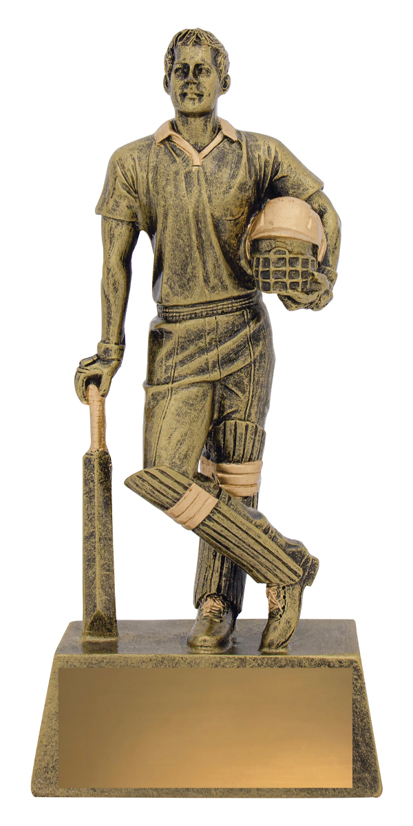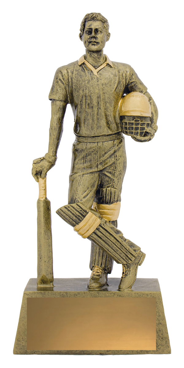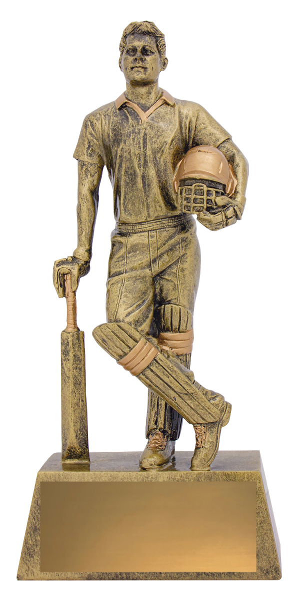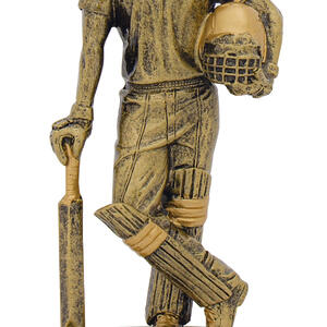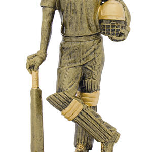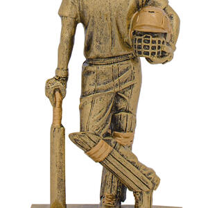 Honouring the spirit of cricket, this distinguished trophy showcases a batsman in full swing, holding his bat and helmet with pride. Finished in refined gold tones, the figurine stands on a sturdy rectangular base, highlighting attention to detail and durability. A classic choice among cricket trophies, it symbolises dedication and achievement on the field.