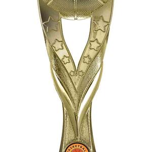 Contemporary gold basketball trophy featuring a large textured ball set on a sleek column with star detailing. Mounted on a black base with an engraving plate, this design offers a bold and modern presentation for standout players.