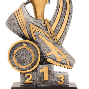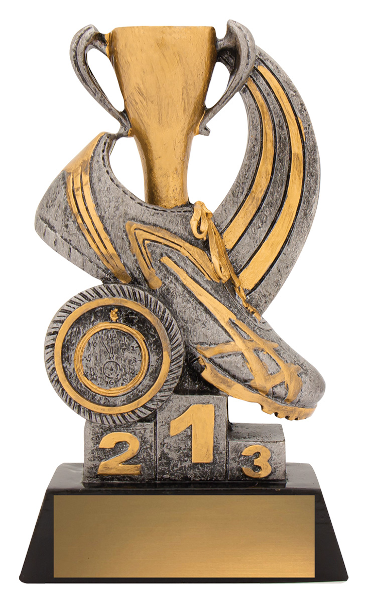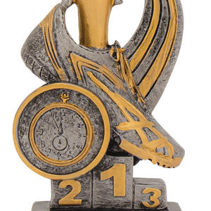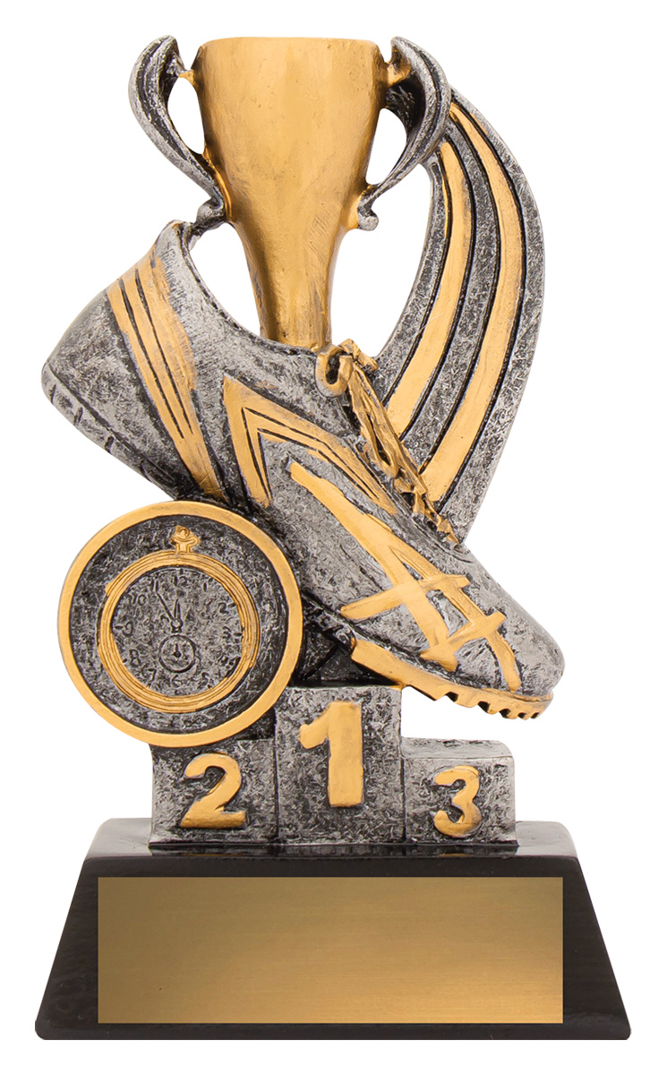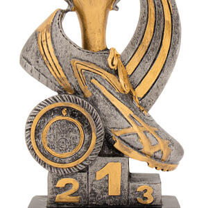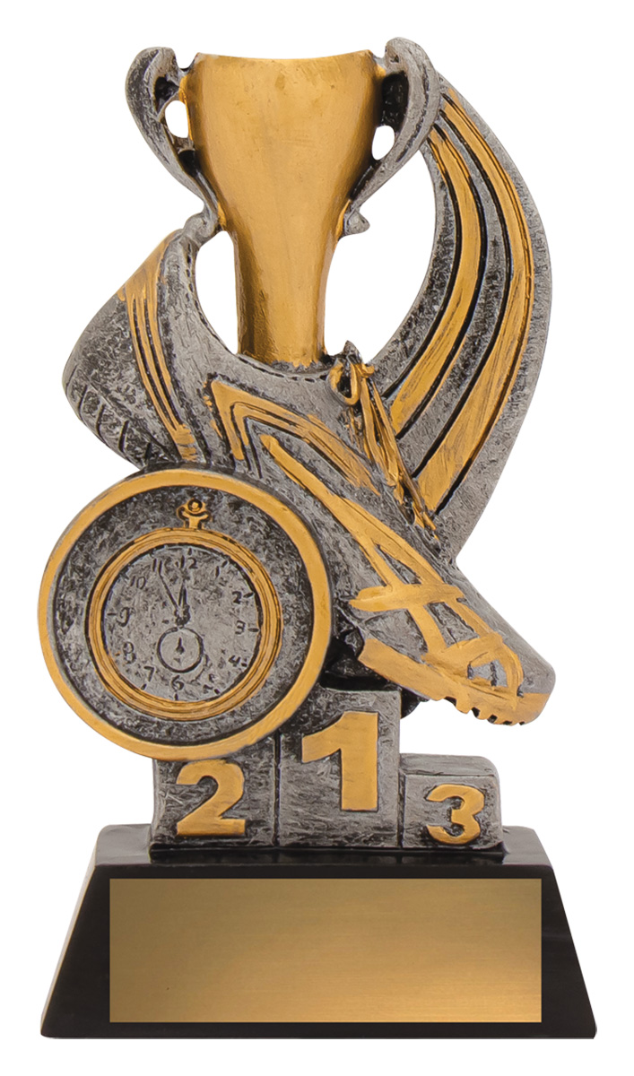 This athletics trophy brings together a classic running shoe, stopwatch, and cup in a striking design, capturing the spirit of timed track events. Finished in elegant gold, silver, and black tones and crafted from quality resin, it offers a memorable way to recognise dedication and achievement in athletics. A trusted choice for celebrating outstanding performance.