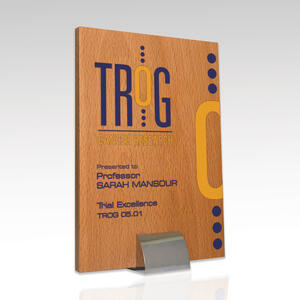A contemporary rectangular bamboo timber trophy finished with a smooth natural surface and crisp full colour digital print. Ideal for corporate events, employee recognition, or sustainability-focused awards. The brushed curved metal base adds a sleek, professional touch to its modern design.