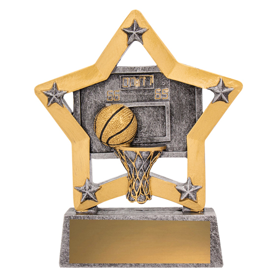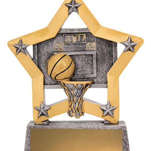 Resin basketball trophy in a silver and gold star frame design. Features a basketball and hoop scene with scoreboard detail, symbolising excellence and competition. Ideal for recognising high performance and team dedication.