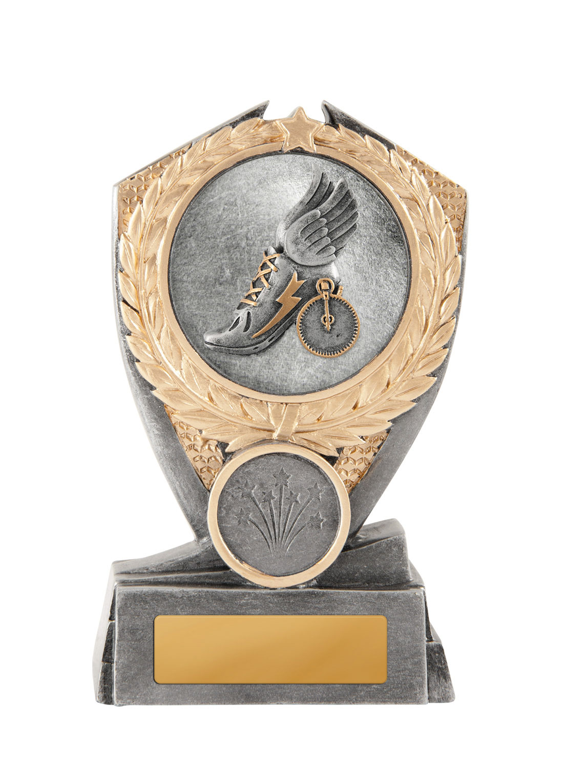 Celebrate athletic achievement with a distinguished athletics trophy crafted for lasting recognition. This award presents a bold combination of gold and silver accented by a winged shoe, stopwatch, and laurel wreath for a truly professional finish.
