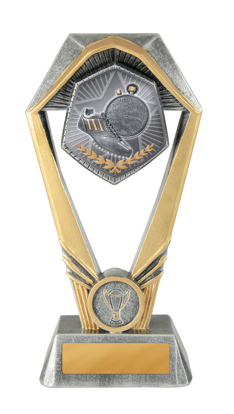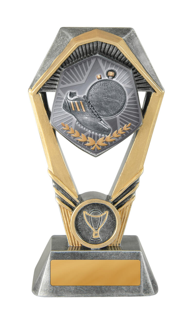 Striking a balance between modern design and classic symbolism, this athletics trophy features a geometric hexagonal top on a sturdy rectangular base. Crafted from resin, it showcases a stopwatch, running shoe, and laurel wreath motif. It offers a professional and memorable way to honour athletic achievement.