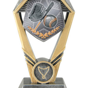 A contemporary baseball trophy designed to honour both individual and team achievements. This trophy features a striking hexagonal emblem displaying a baseball, bat, and glove motif, finished in a blend of gold and silver for a sophisticated look.