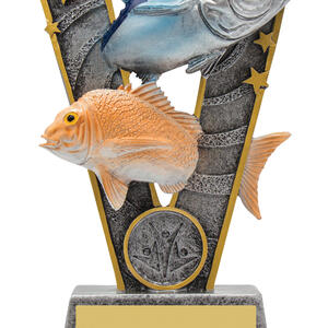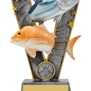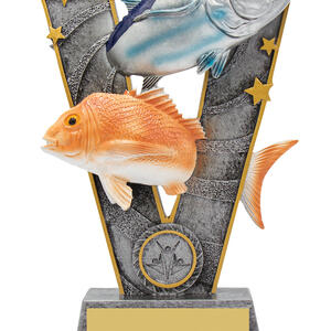 Celebrate angling achievement with this fishing trophy, crafted in a distinctive 'V' shape and finished in gold, silver, orange, and blue tones. Two contrasting fish figures, accented by star decorations and a circular emblem at the base, create a memorable and exclusive design. This durable resin piece offers a professional and vibrant recognition for any fishing event.