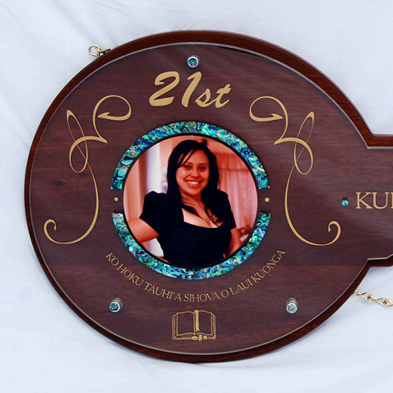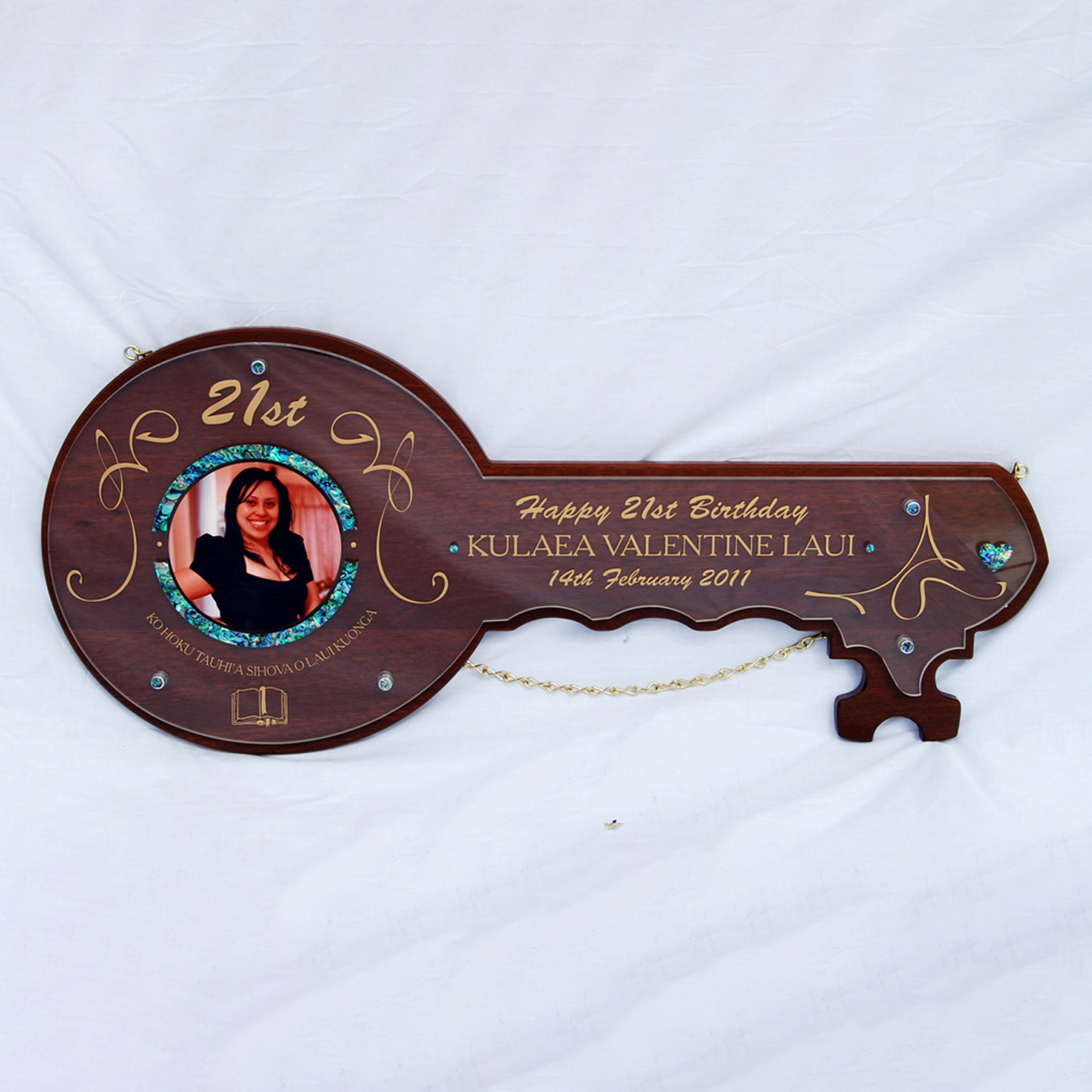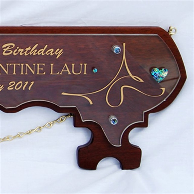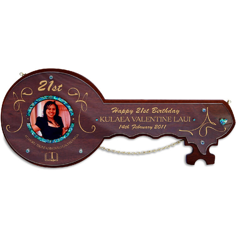 This elegant 21st key is hand crafted from solid timber with a rich polished finish. It features laser etched lettering, a cut out crystal insert, and stunning mother of pearl inlays for a touch of luxury.