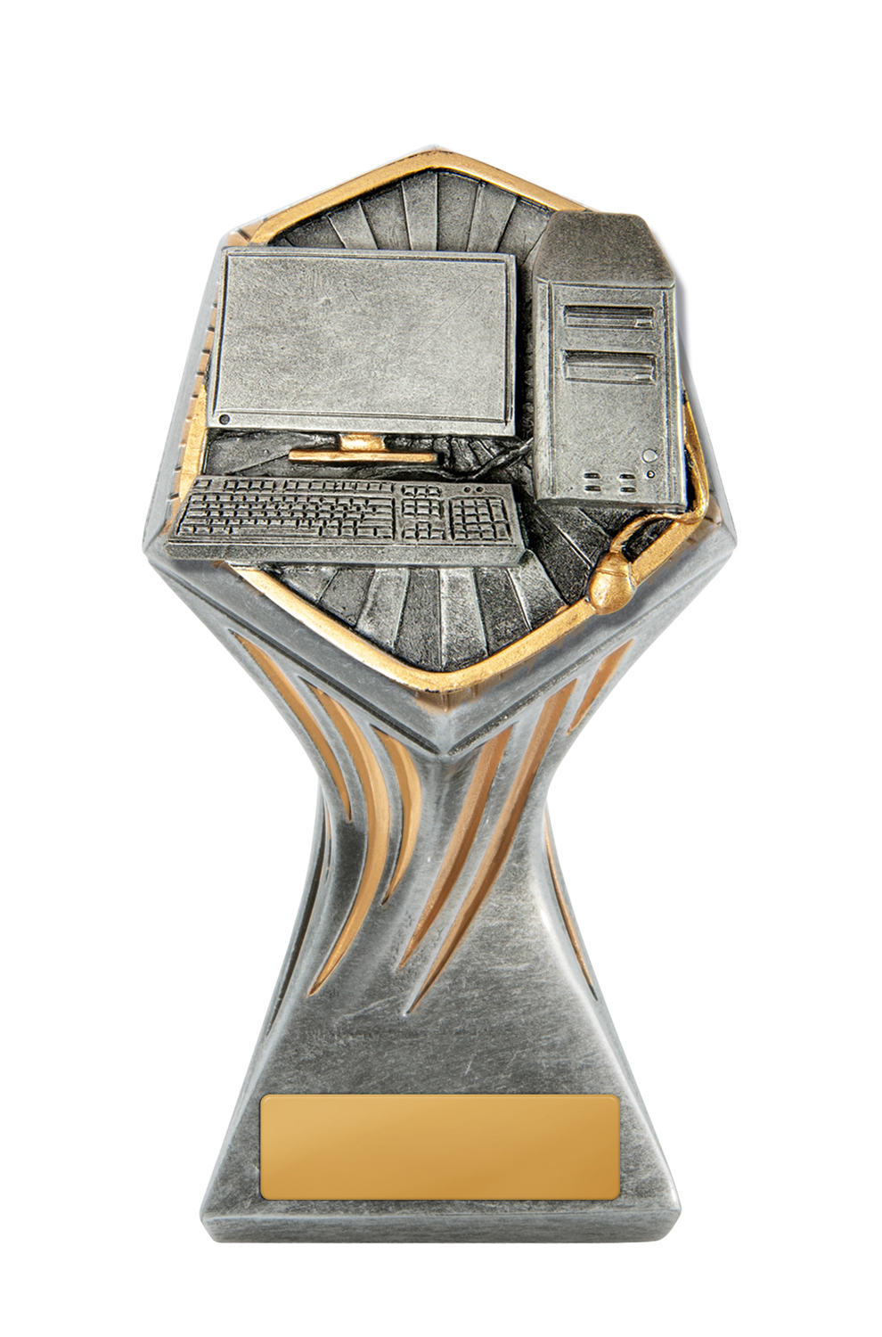 Showcasing a striking hexagonal top and crafted from quality resin, this technology award trophy is designed to honour achievement in the digital arena. The sleek silver and gold tones highlight a detailed computer setup, complete with monitor, keyboard, and CPU elements. Ideal for recognising excellence in technology, this award offers a memorable and professional presentation.