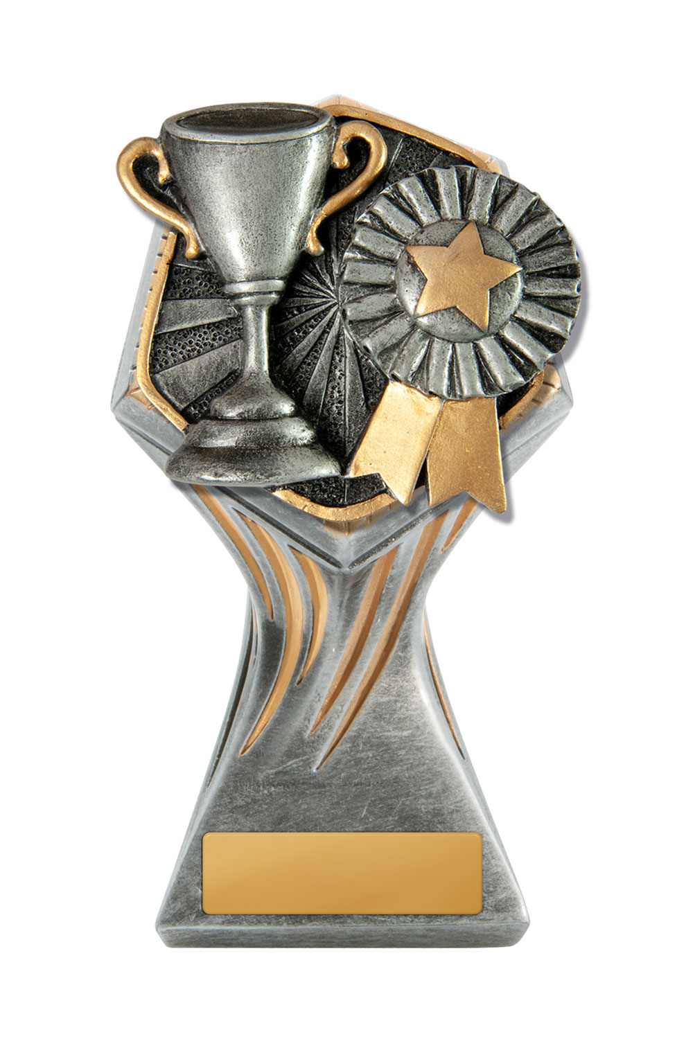An elegant choice among award trophies, this Gladiator Series Achievement piece features a sophisticated blend of silver and gold tones. Crafted from resin, it showcases a cup and ribbon motif on a sturdy hexagonal base, offering both visual impact and durability. The base provides an area for personalisation, making it ideal for celebrating a wide range of achievements.