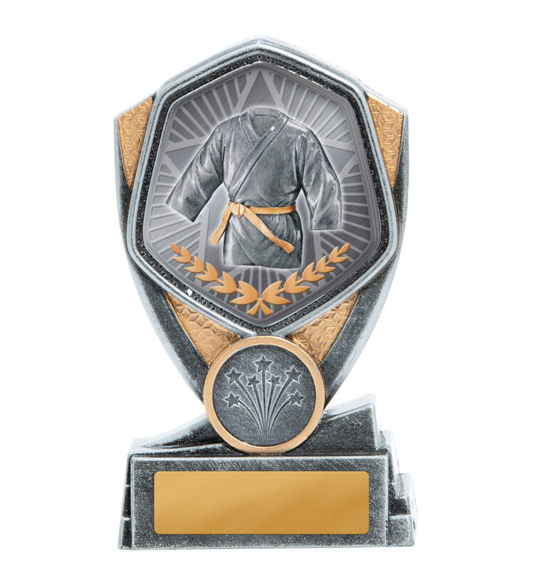 Crafted in antique silver and gold resin, this martial arts trophy features a detailed gi design surrounded by a laurel wreath. Suitable for a variety of martial arts disciplines, it represents discipline, respect, and achievement. Includes engraving plate for personalisation.