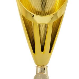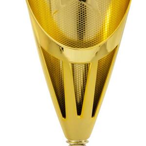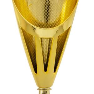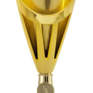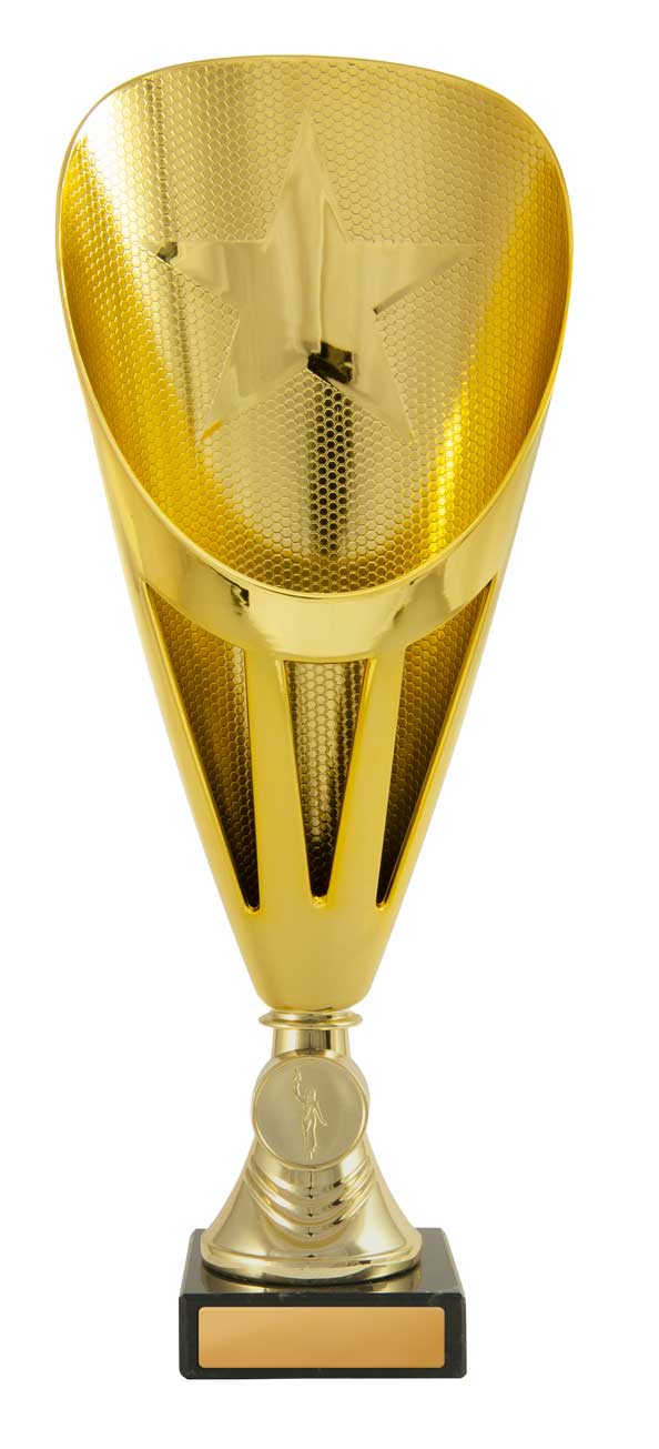 This gold trophy cup from our dance cups collection celebrates achievement with its striking wide, flared top and star accented design. Crafted from a blend of metal, plastic, and marble, it features a gleaming gold finish complemented by a sturdy black base and gold engraving plate. This award offers a timeless way to honour excellence and is customisable with precision engraving.