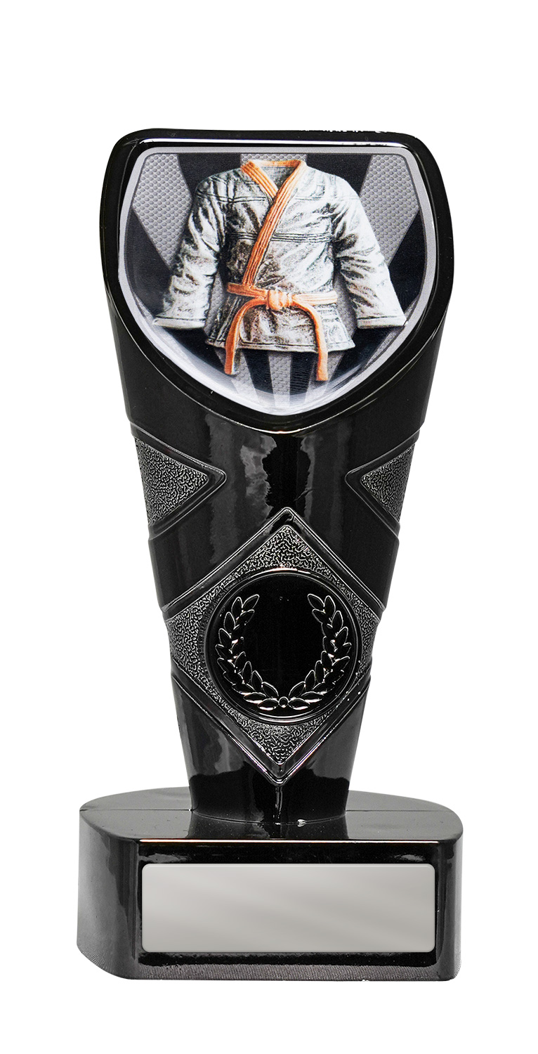Distinguished by its bold black and silver, palette, this martial arts trophy captures the spirit of achievement in karate tournaments and martial arts events. It features a striking martial arts uniform with an orange belt on a broad top and narrow base. Ideal for recognising excellence, this award is a refined addition to karate trophies collections.