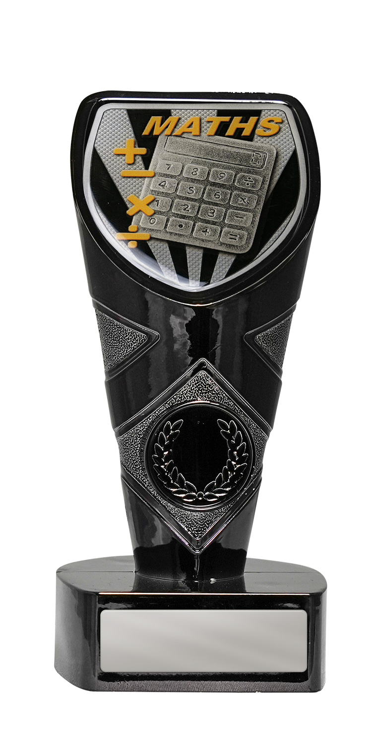 Crafted in sleek black, silver, or gold finishes, this maths trophy features a contemporary shield design with prominent mathematical symbols and a calculator motif. Ideal for education awards in schools or offices, it recognises achievement in mathematics with professional style.
