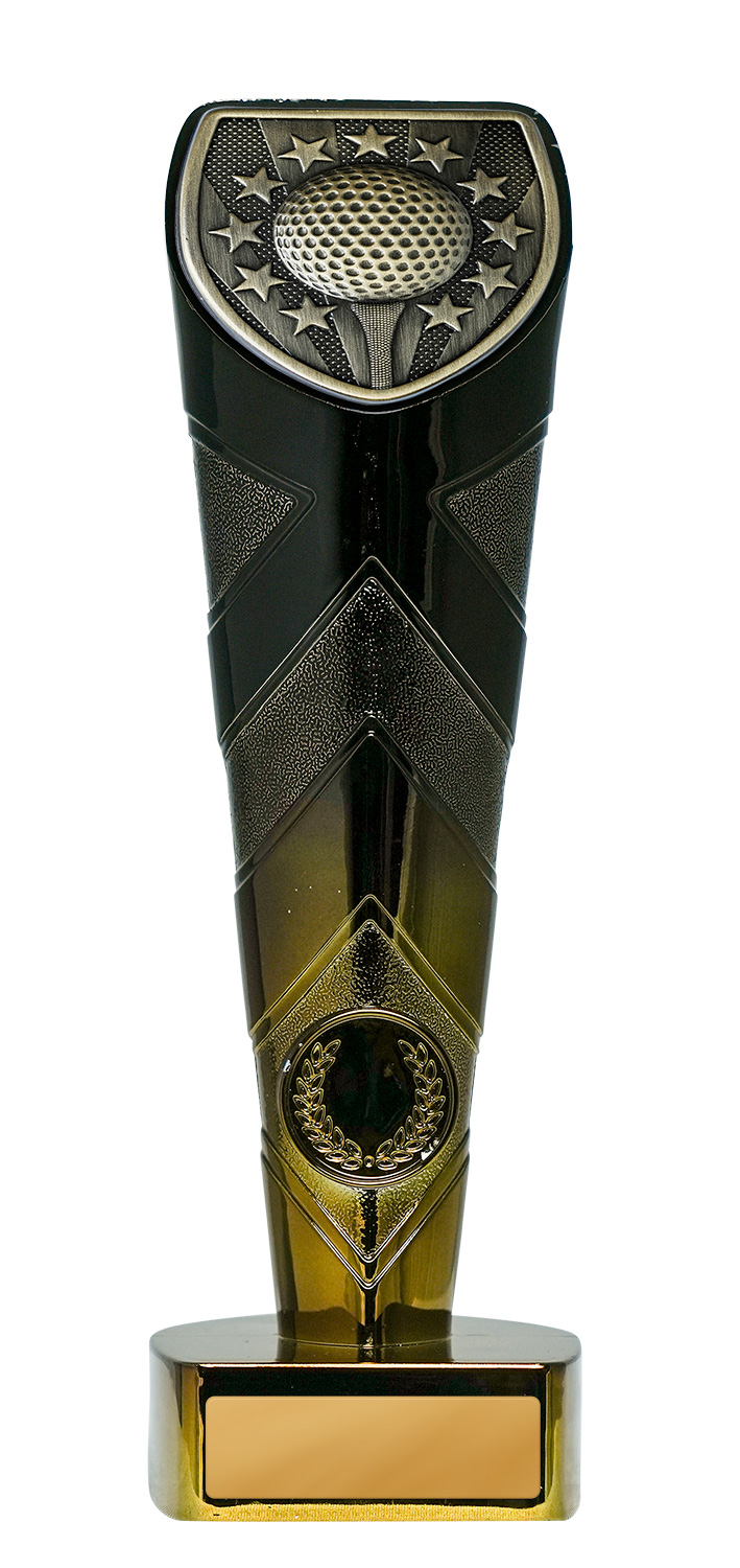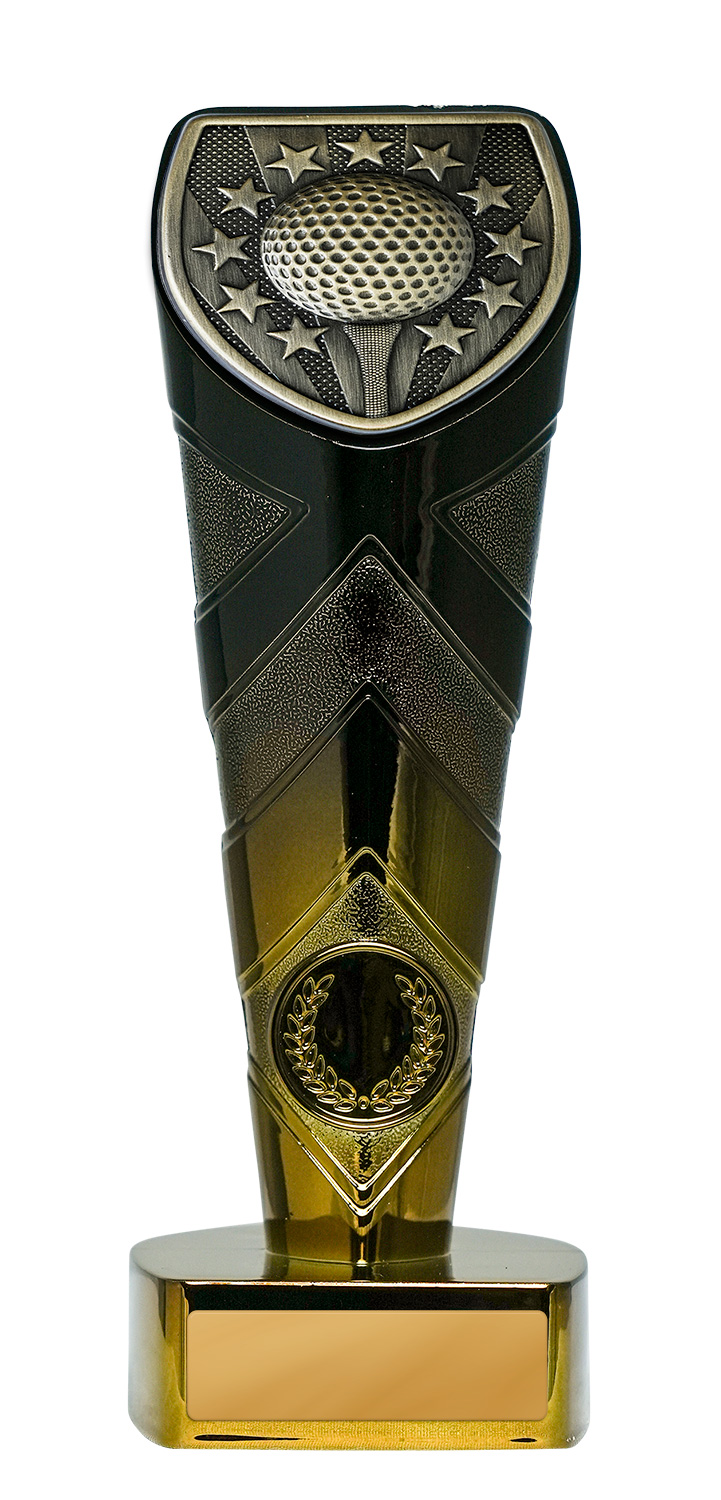 Striking and contemporary, this golf trophy combines gold, black, and bronze tones for a refined presentation. The shield shaped top frames a golf ball motif, while the laurel wreath base with a star accent adds a celebratory touch. Crafted from resin, it is ideal for recognising outstanding achievement at golf tournaments and club presentations.