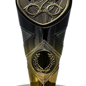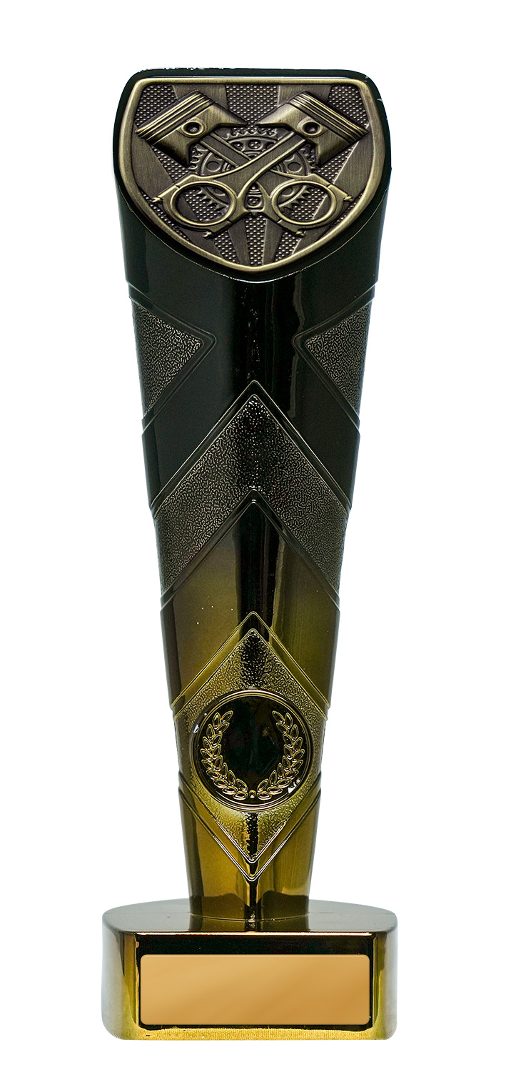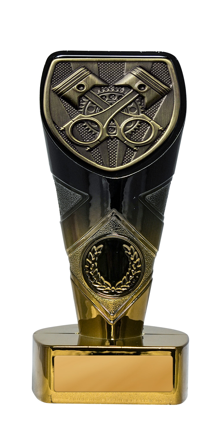 Engineered for distinction, this motorsport trophy showcases a bold gold and black design with a shield shaped top. Crossed pistons and gears form the centrepiece, complemented by a laurel wreath emblem at the base for a refined finish. Crafted from resin, it offers a professional platform for recognising achievement in motorsport, with a plaque area for personalisation. Ideal for those seeking memorable motorsport trophies.