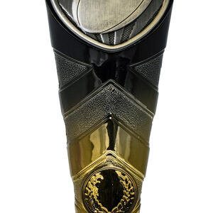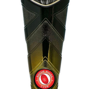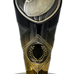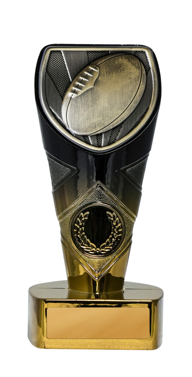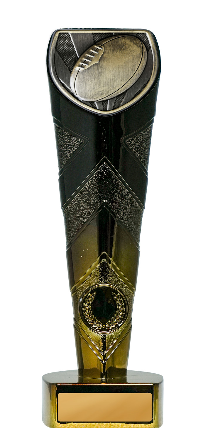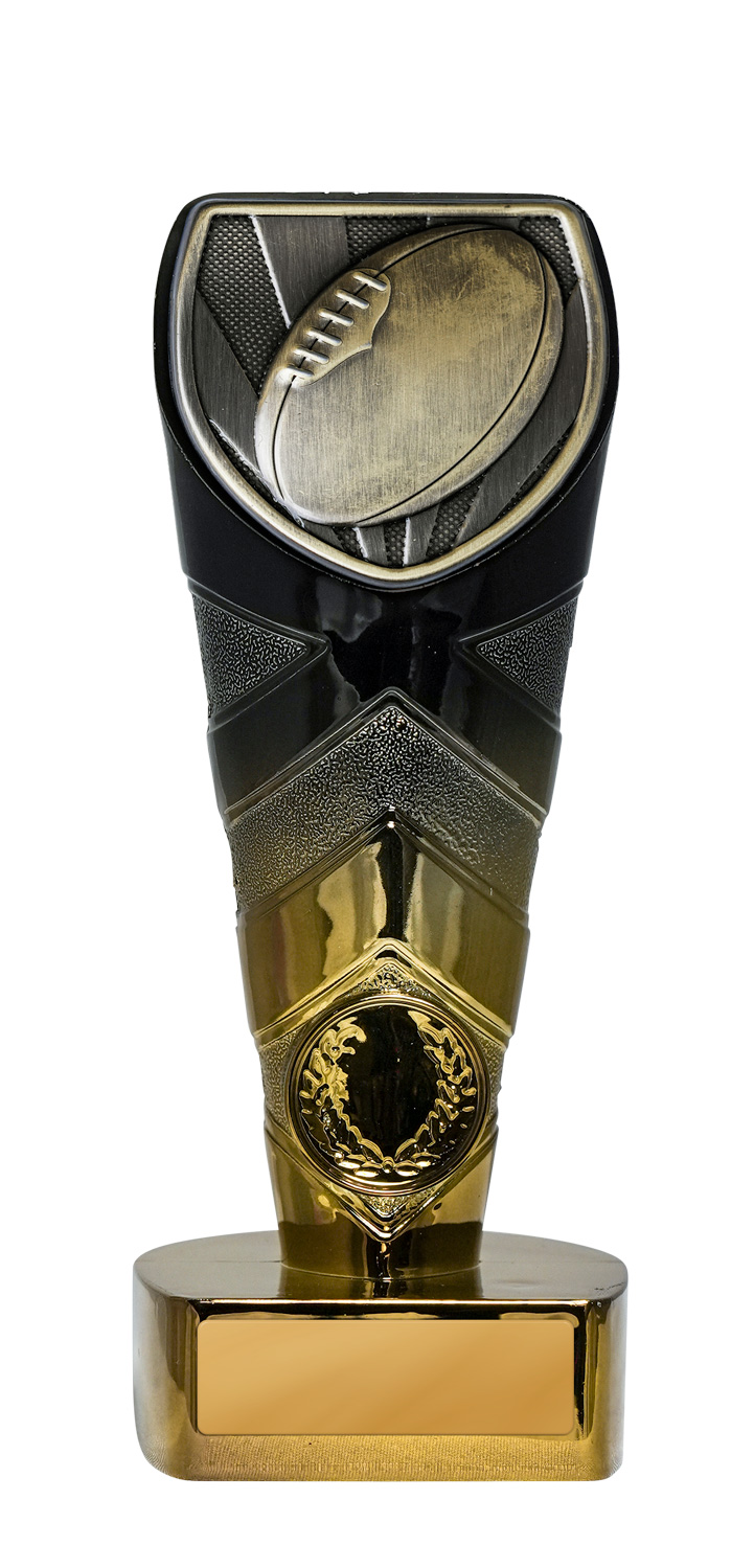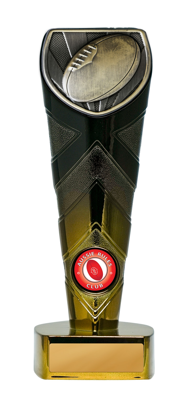 Designed for those who value tradition and achievement, this aussie rules trophy features a striking gold, black, and bronze finish. Its curved top showcases a detailed football design, while the sturdy rectangular base is highlighted by a laurel wreath emblem.