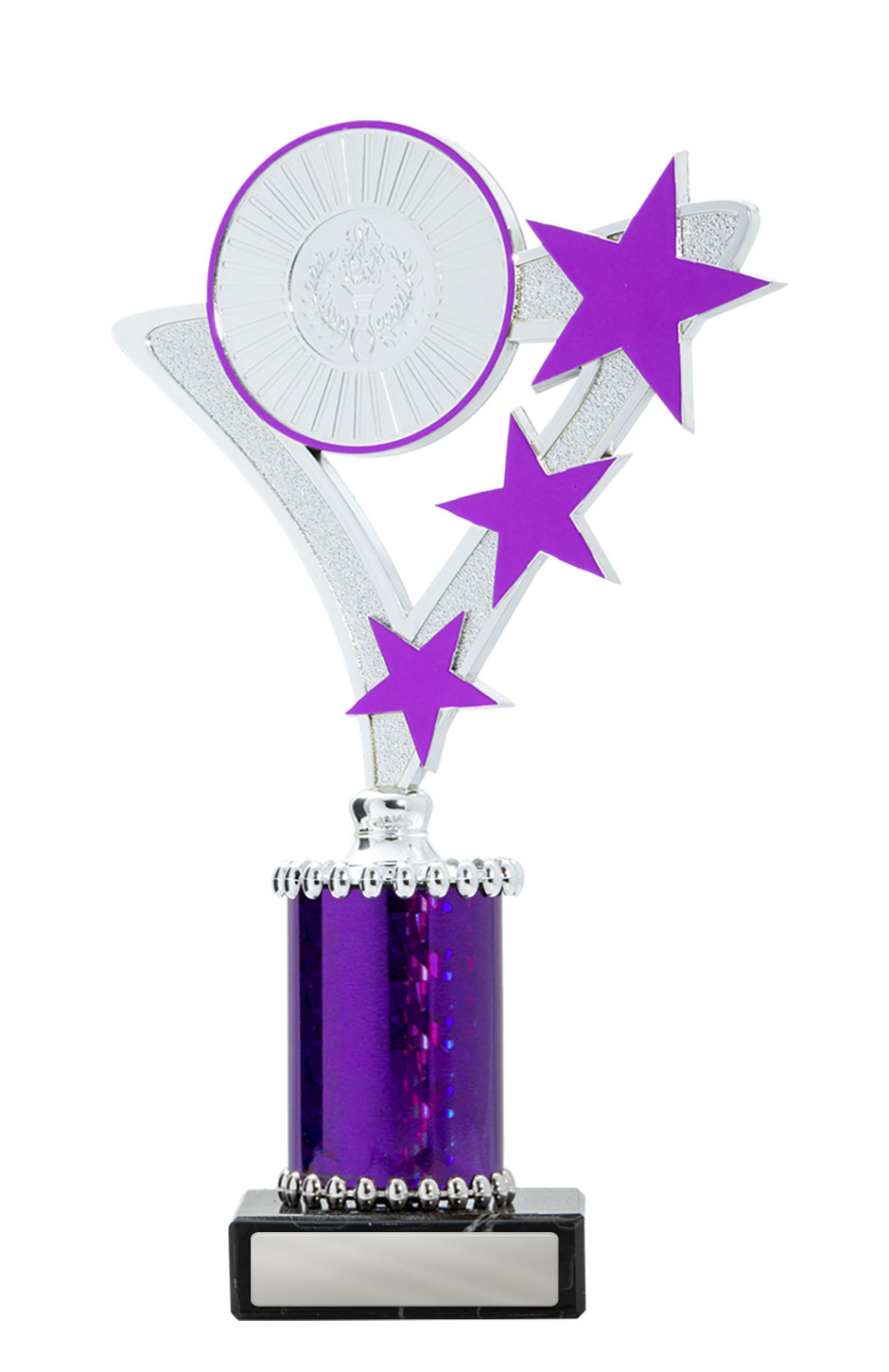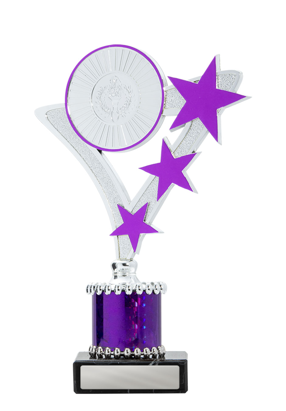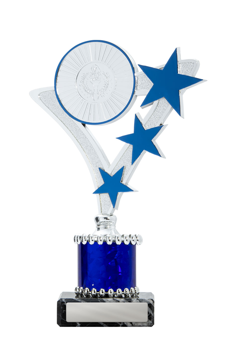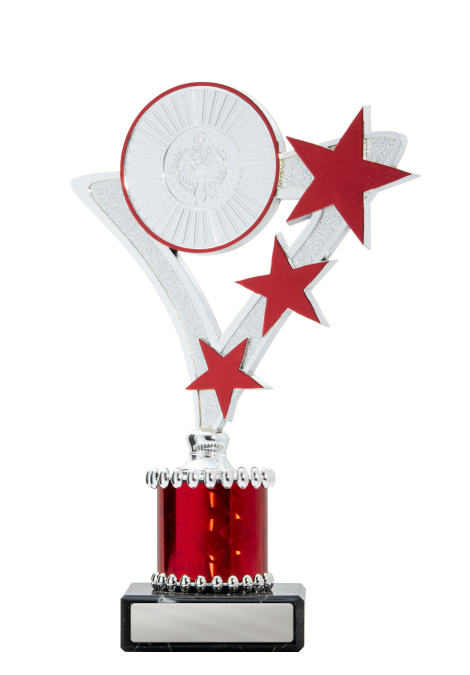 This trophy cup stands out with a metallic inspired finish and vibrant colour options, complemented by star shaped accents and a circular emblem at the top. It offers durability and a refined look for sports, party games, or award ceremonies. The base allows personalisation with engraving, supporting meaningful recognition across a variety of events.