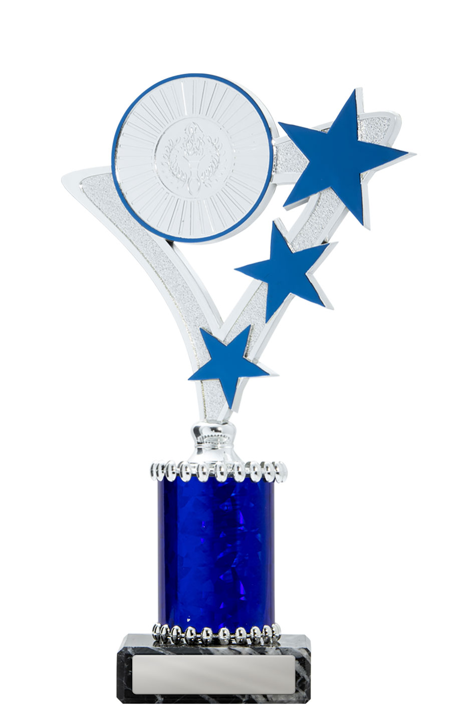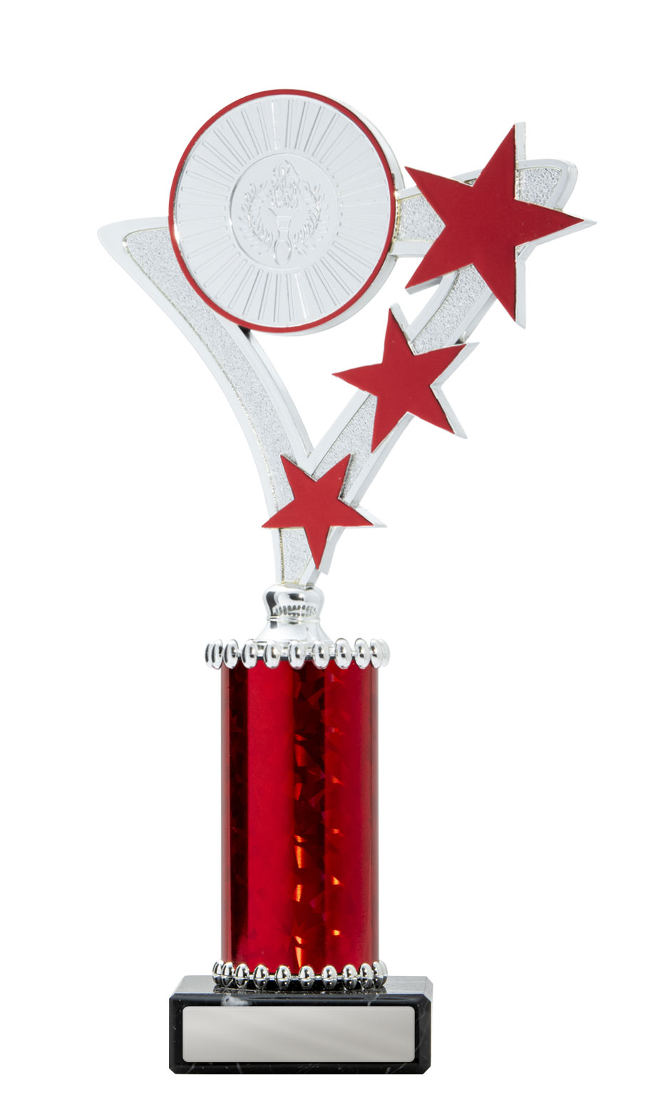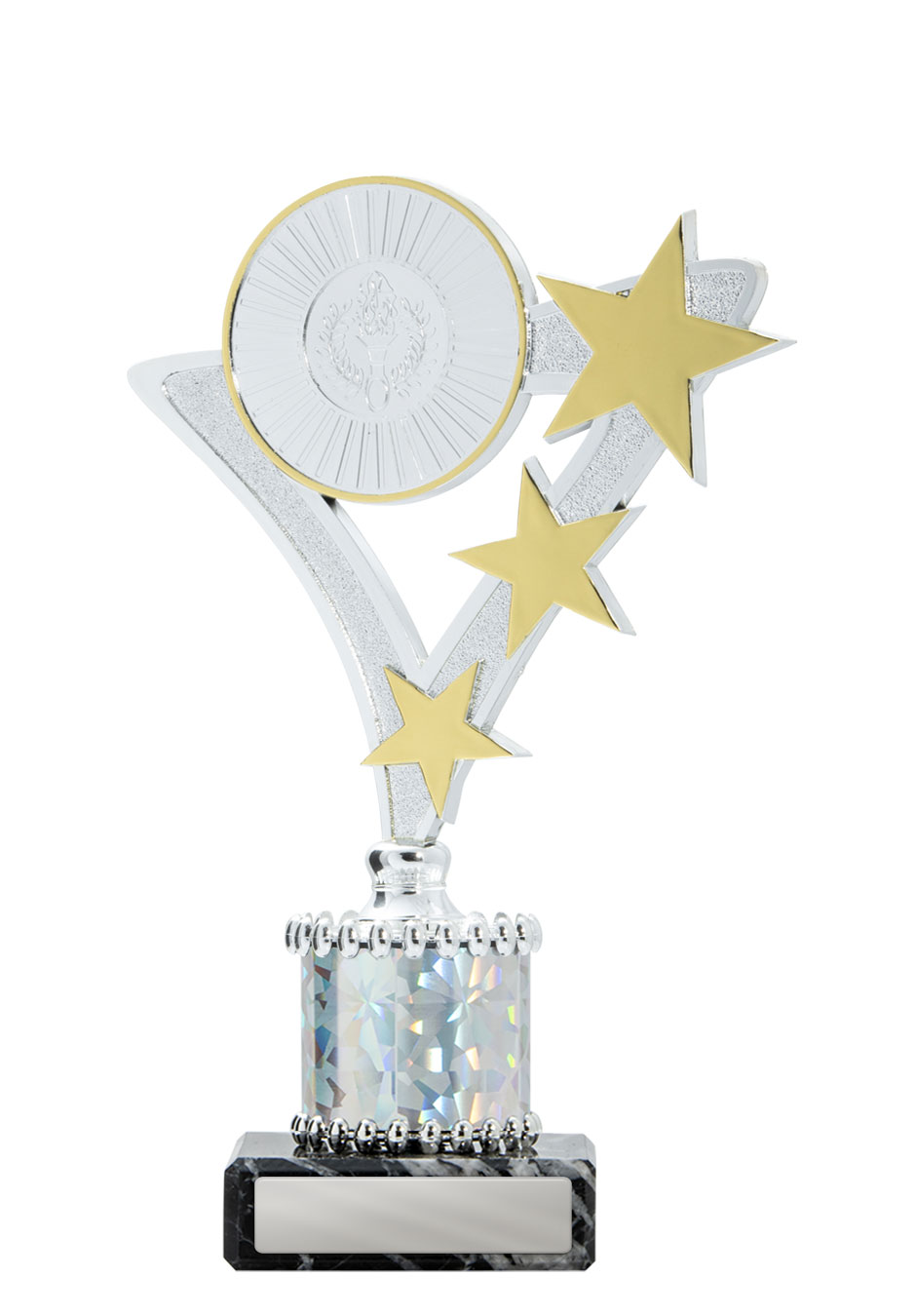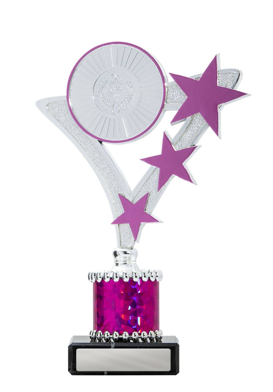 This trophy cup stands out with a metallic inspired finish and vibrant colour options, complemented by star shaped accents and a circular emblem at the top. It offers durability and a refined look for sports, party games, or award ceremonies. The base allows personalisation with engraving, supporting meaningful recognition across a variety of events.