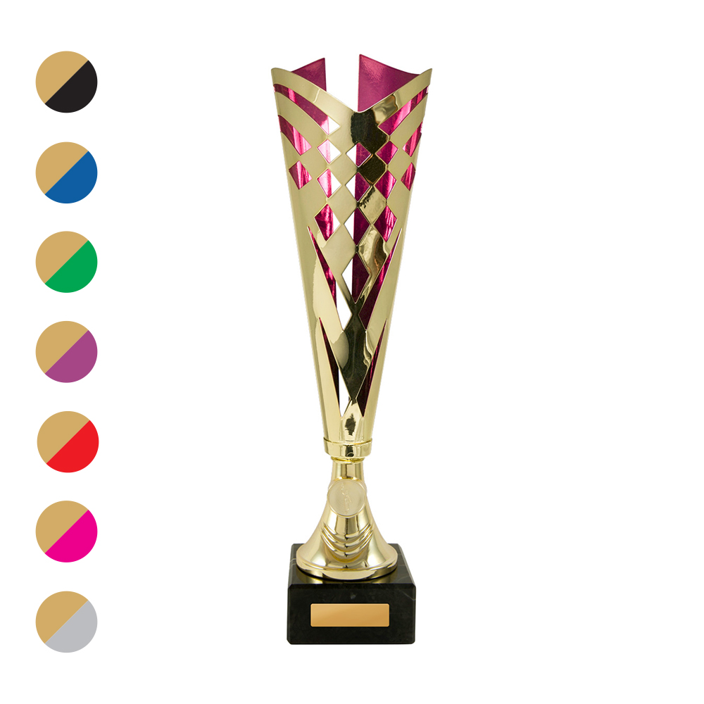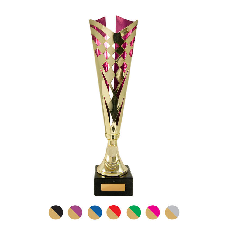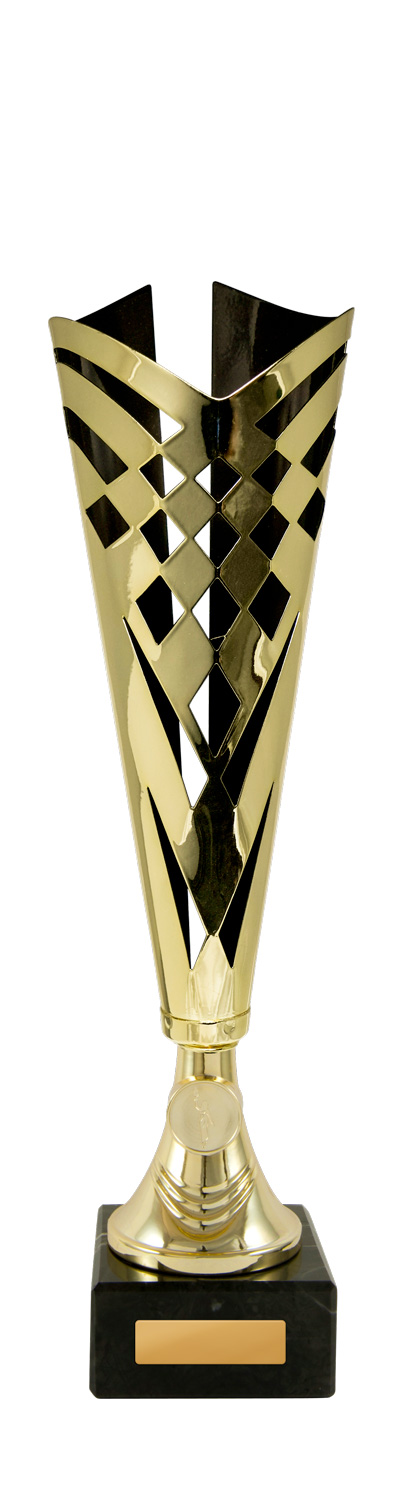 Celebrate achievement with a gold and black trophy cup designed for distinction across any sporting occasion. The Riviera Cup stands out with its elegant flared top, decorative lattice design, and striking accents. These sports trophies create a memorable focal point for recognising success in general sports events.