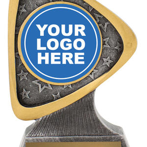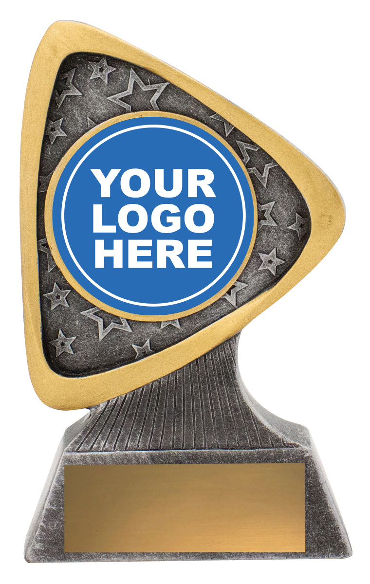 Stylish and contemporary, this silver and gold resin trophy features a triangular design filled with star accents. The round centre area is perfect for your custom logo or a standard sport insert.