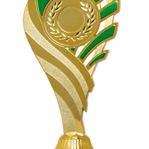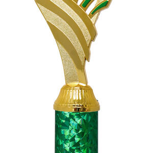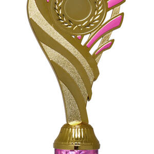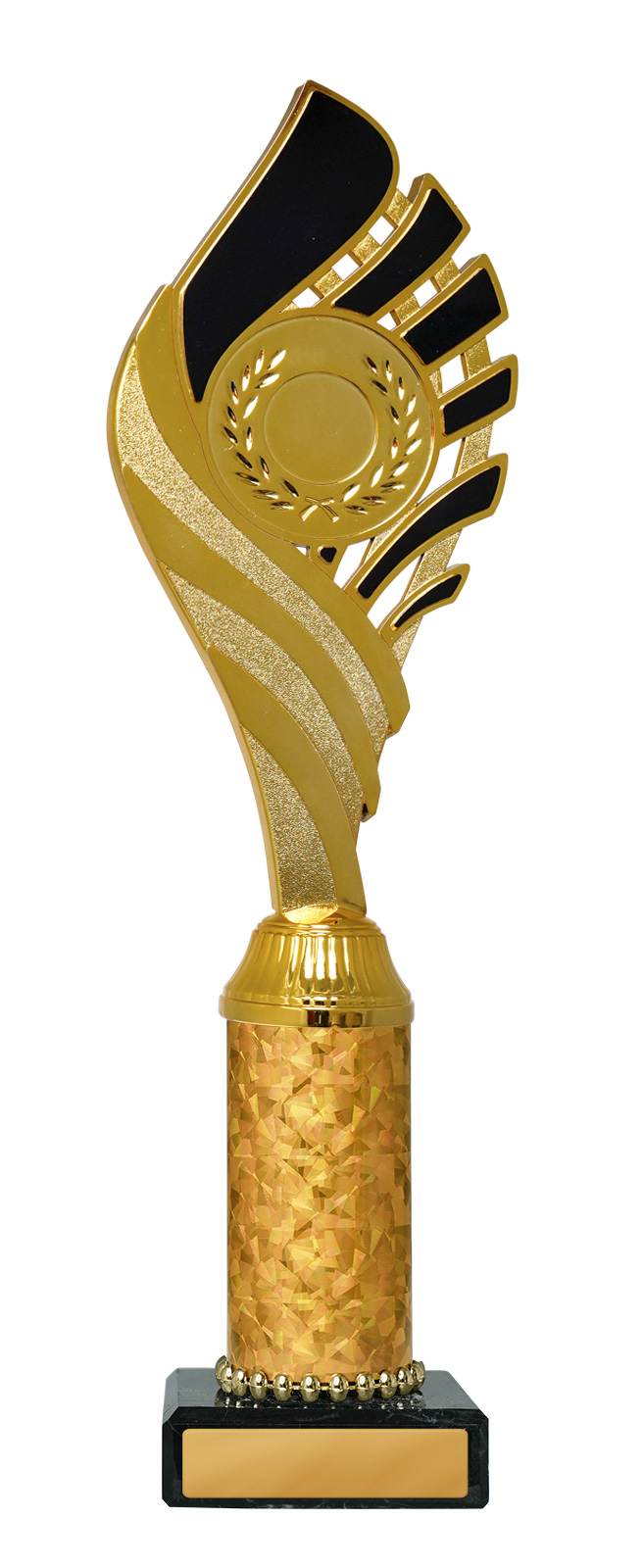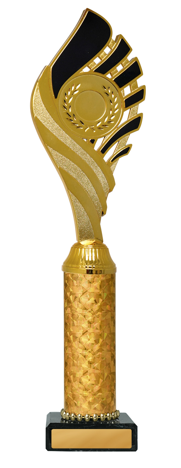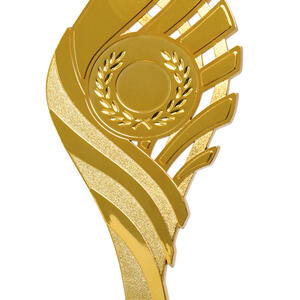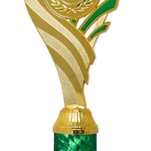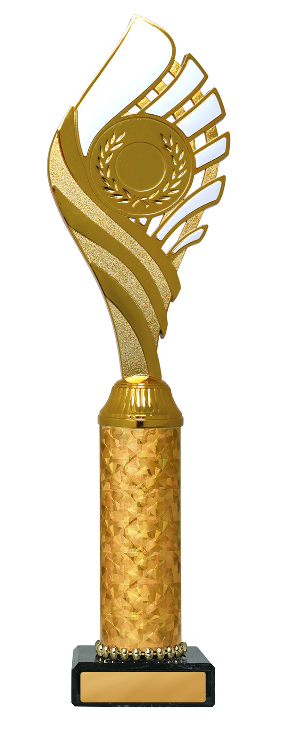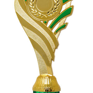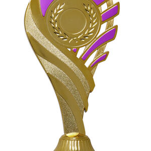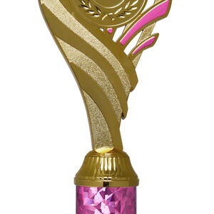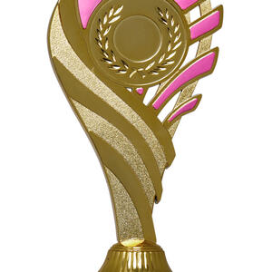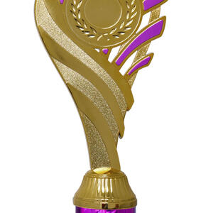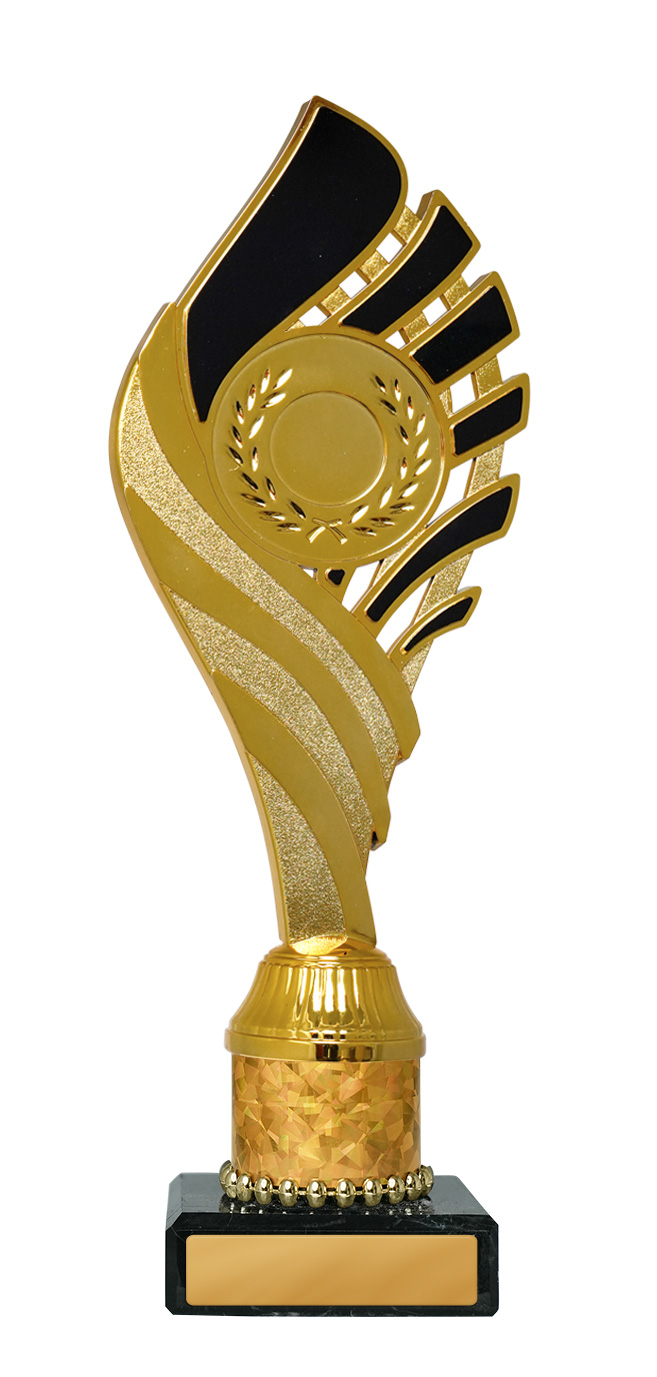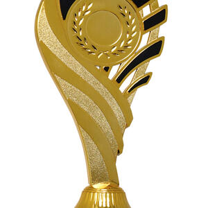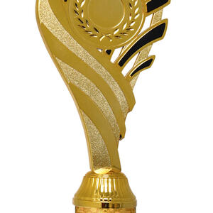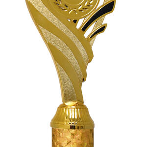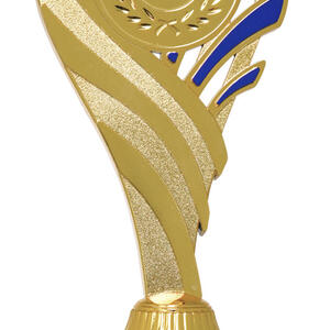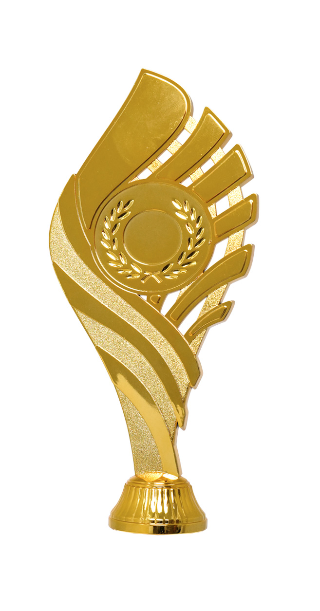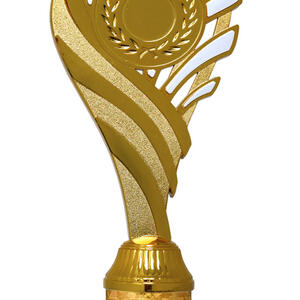 This collection of trophy cups presents a contemporary curved silhouette, finished in gold with a silver vivid accent colours. Each trophy showcases a decorative laurel wreath and a sturdy cylindrical base, blending plastic and metal materials for lasting quality. The blank plaque and 25mm centre allow for tailored personalisation, ideal for dance cups, sporting achievements, or event recognition.