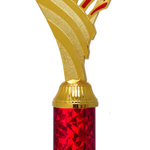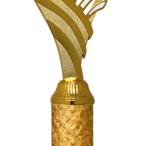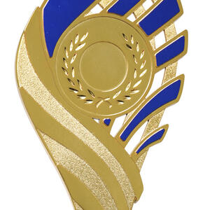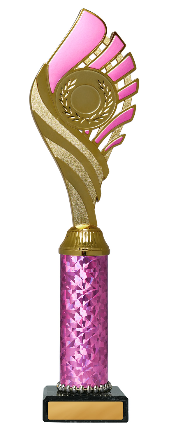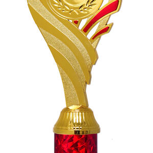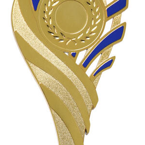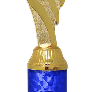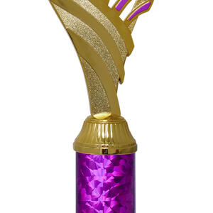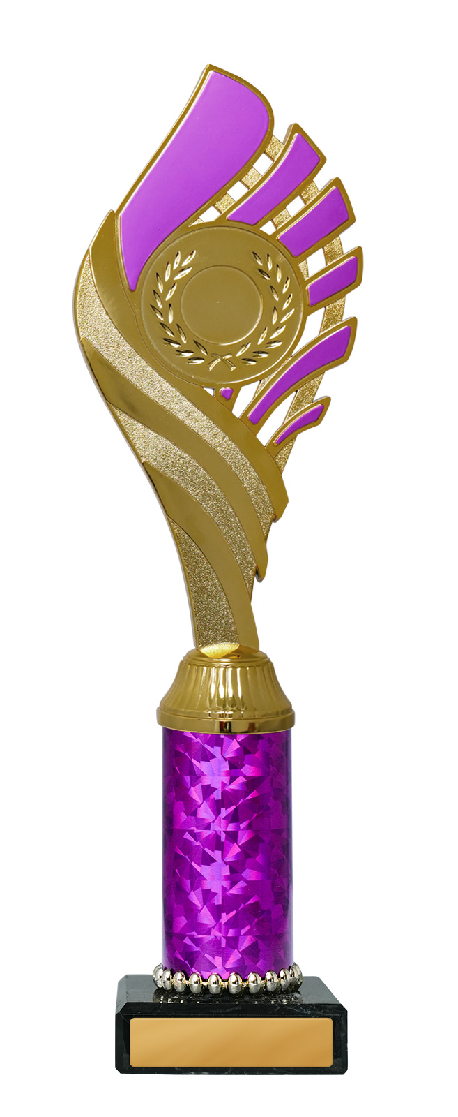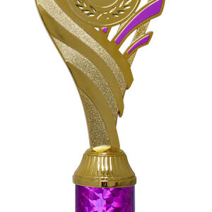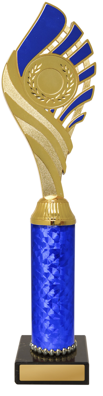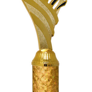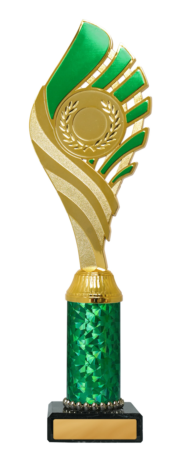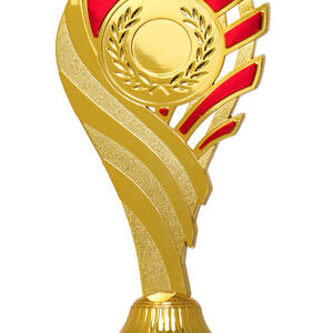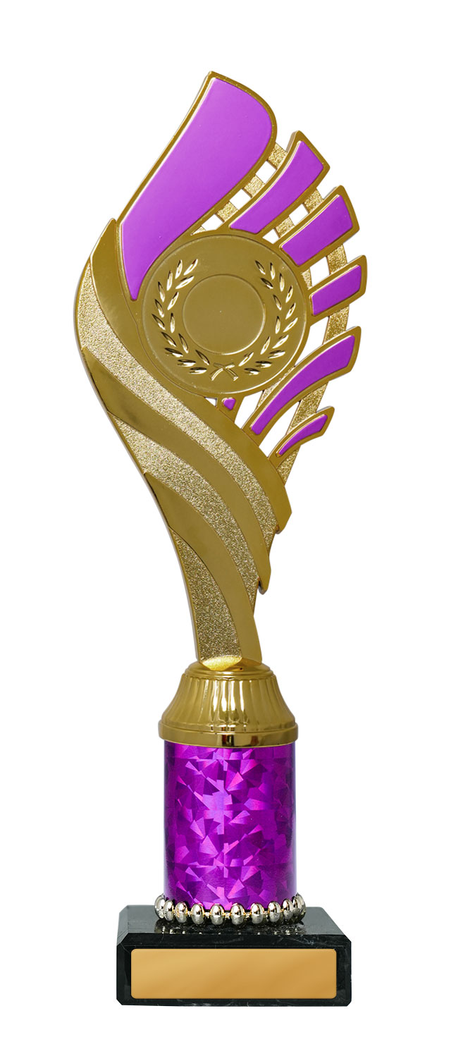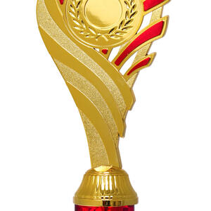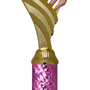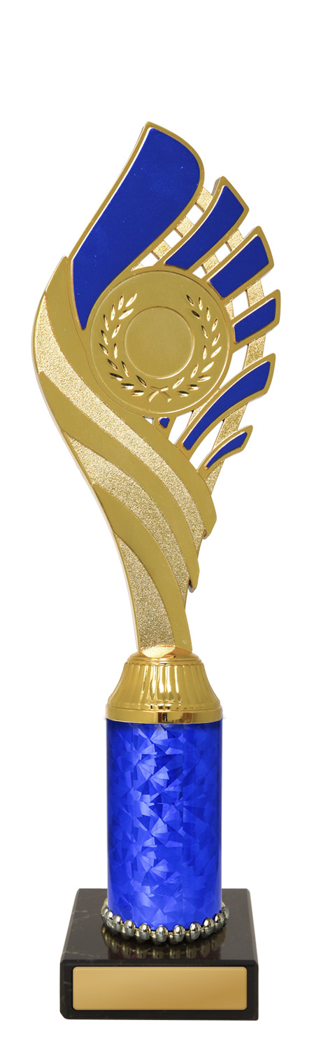 This collection of trophy cups presents a contemporary curved silhouette, finished in gold with a silver vivid accent colours. Each trophy showcases a decorative laurel wreath and a sturdy cylindrical base, blending plastic and metal materials for lasting quality. The blank plaque and 25mm centre allow for tailored personalisation, ideal for dance cups, sporting achievements, or event recognition.