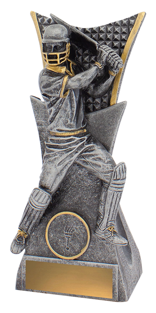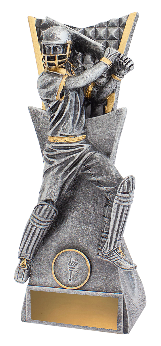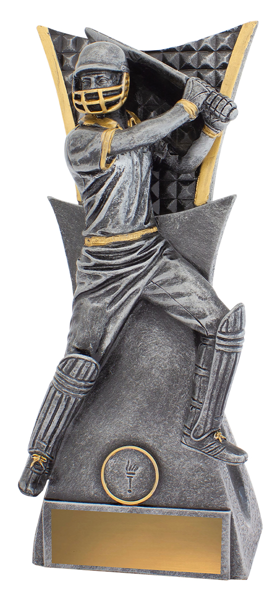 Celebrate cricketing achievement with this contemporary cricket trophy, featuring a detailed batter in full swing. Crafted in resilient silver and gold resin, its dynamic design captures the spirit of the game. The sturdy base provides a space for personalisation, making it an elegant choice for recognising standout moments on the cricket field.