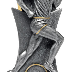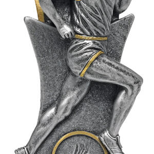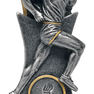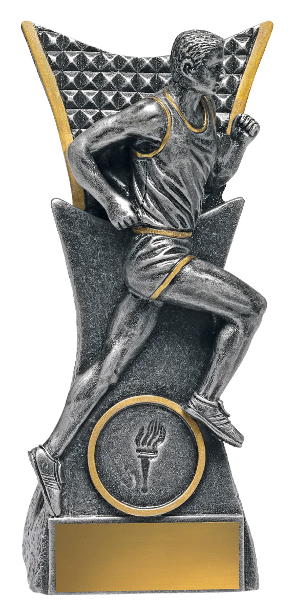 This athletics trophy features a striking male runner figure captured in mid stride, embodying athleticism and progress. Crafted in gleaming silver and gold with a refined metallic finish, it includes a torch emblem that signifies achievement in running and athletics. The elegant base completes this durable and distinguished recognition piece.