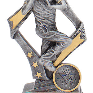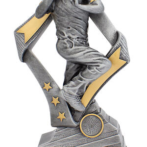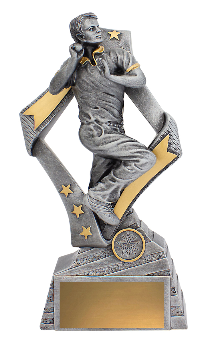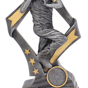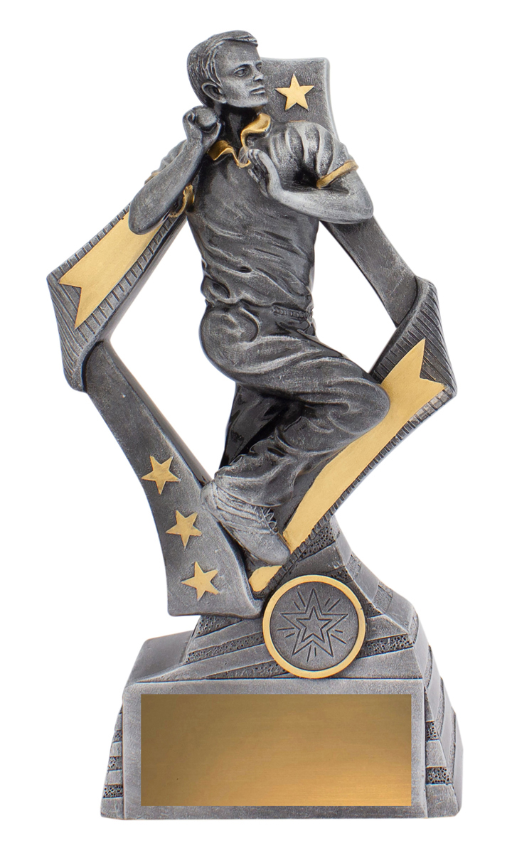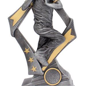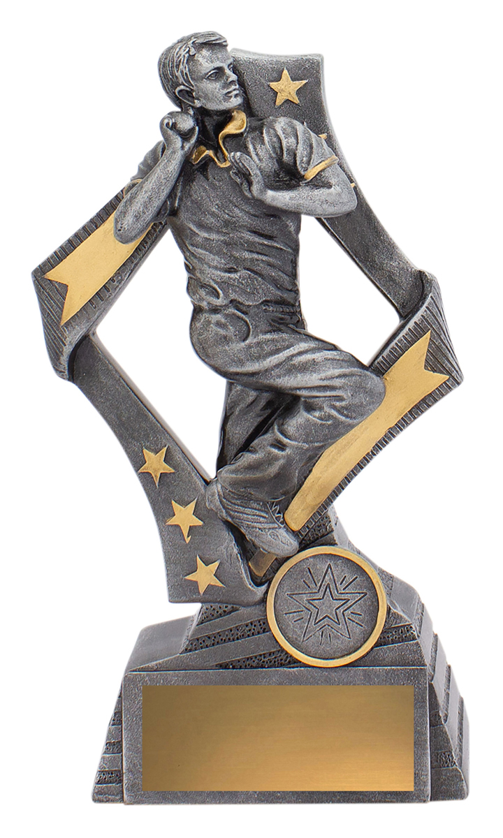 This cricket trophy features a dynamic bowler in full motion, set against striking star and arrow motifs. The combination of silver and gold accents highlights its professional finish, making it a fitting choice for recognising outstanding cricket performance. Crafted from durable resin, it offers a dignified base ready for personalisation.