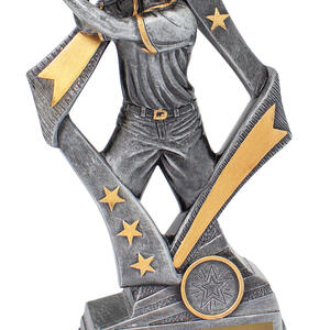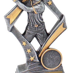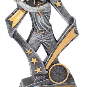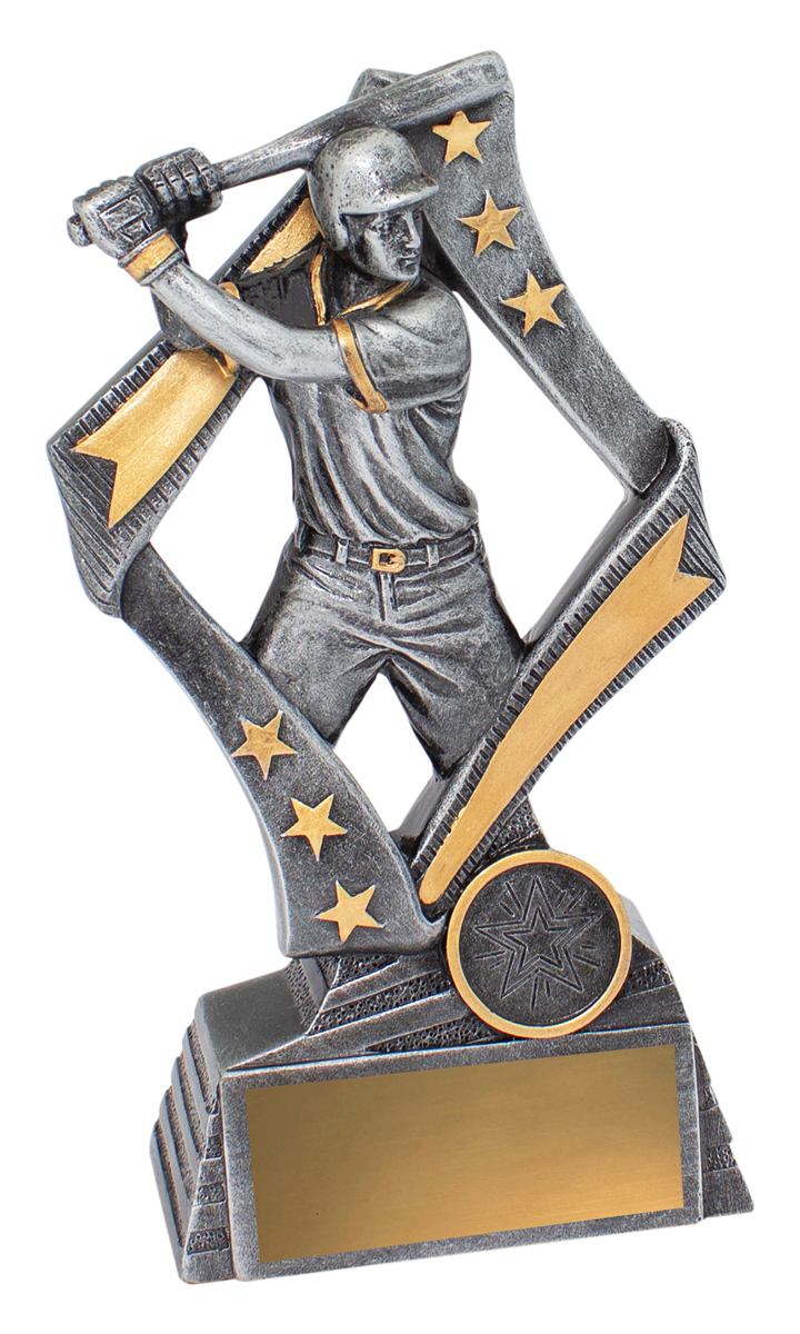 This baseball trophy features a striking silver and gold finish with a detailed player in a powerful batting stance. Crafted from durable resin, its contemporary design is accented by star motifs, capturing the spirit of the game. An understated base provides space for personalisation, making it an ideal choice for honouring outstanding baseball achievement.