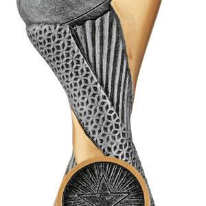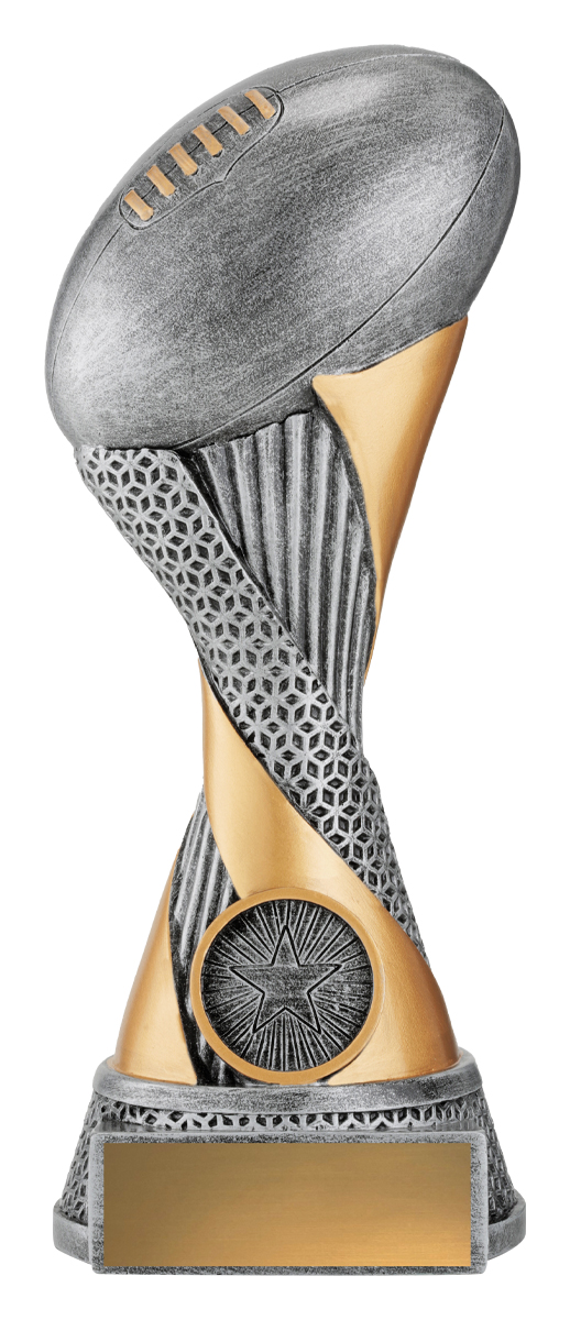 Crafted for recognition in Aussie Rules Football, this premium aussie rules trophy features a striking football motif atop a bold, textured base. The elegant combination of silver and gold finishes highlights the star emblem and quality resin construction, creating a memorable award that celebrates both achievement and team spirit in the sport.