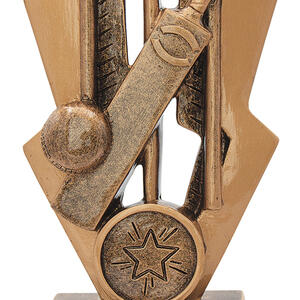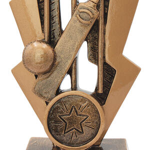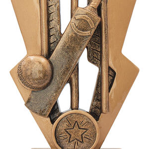 This trophy showcases a bold cricket motif, expertly crafted in gold tones with a refined metallic finish. Featuring a detailed cricket bat, ball, and stumps atop a sturdy rectangular base, it stands as a fitting symbol of sporting achievement. An ideal choice for those seeking cricket trophies that combine elegance, durability, and a professional aesthetic.